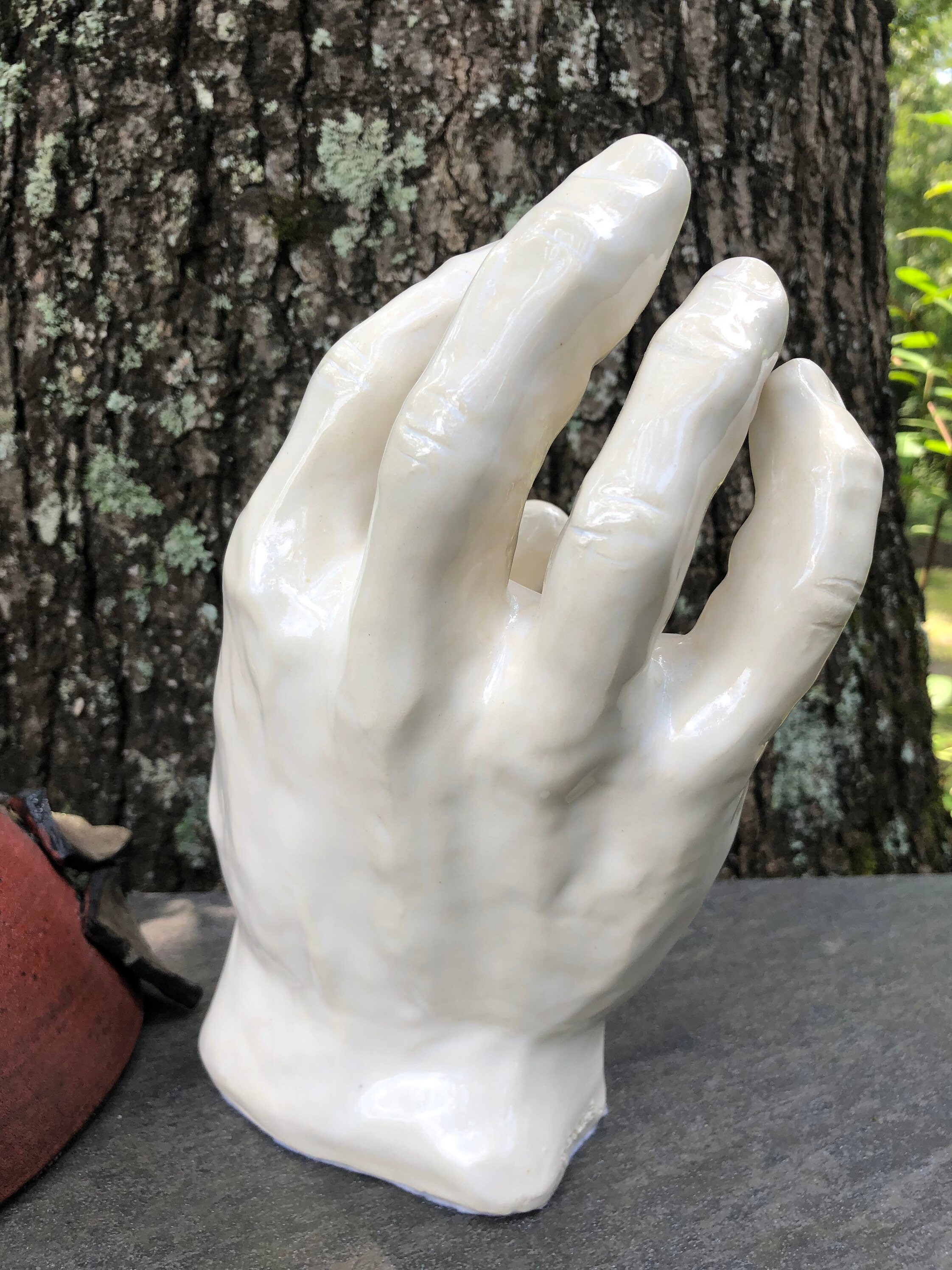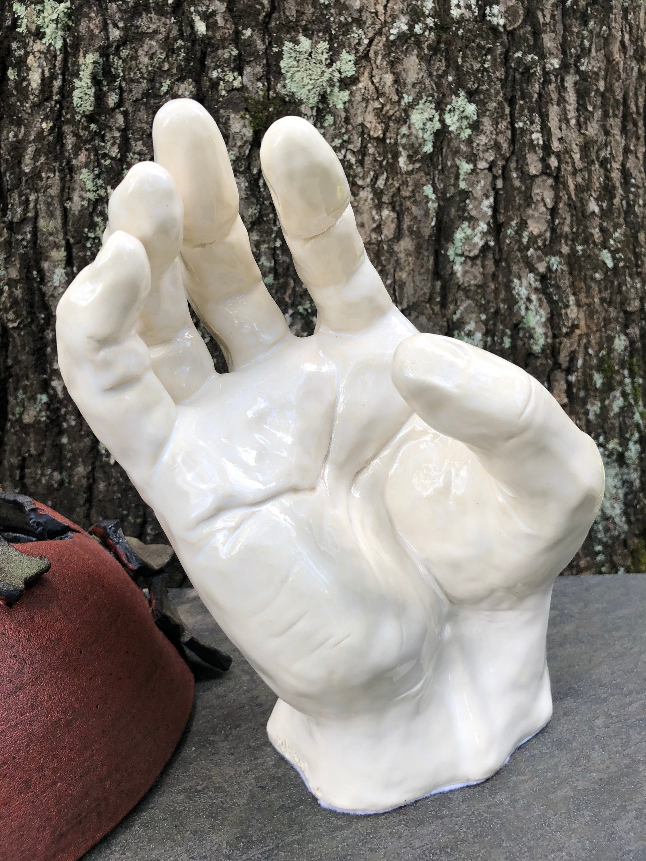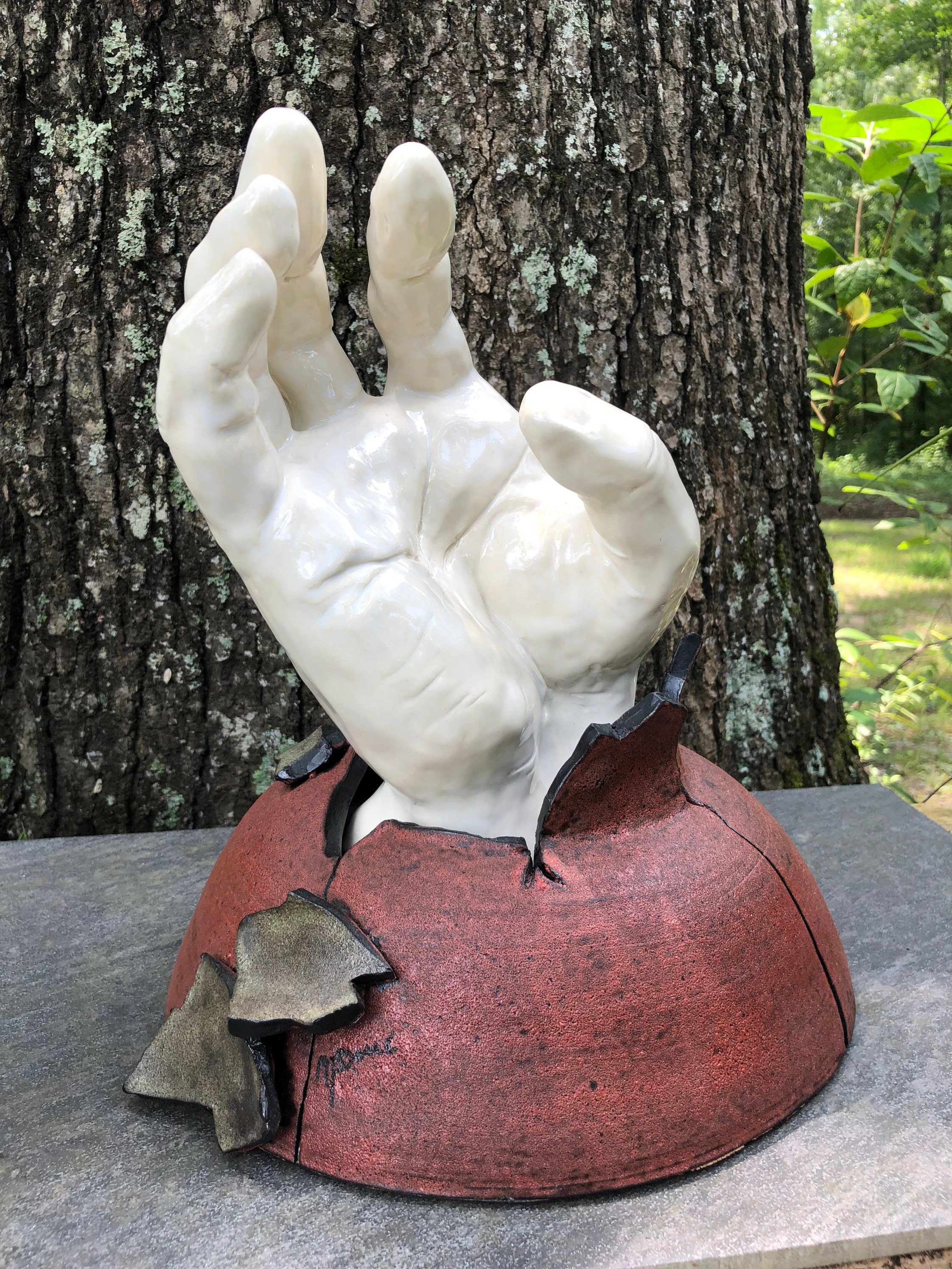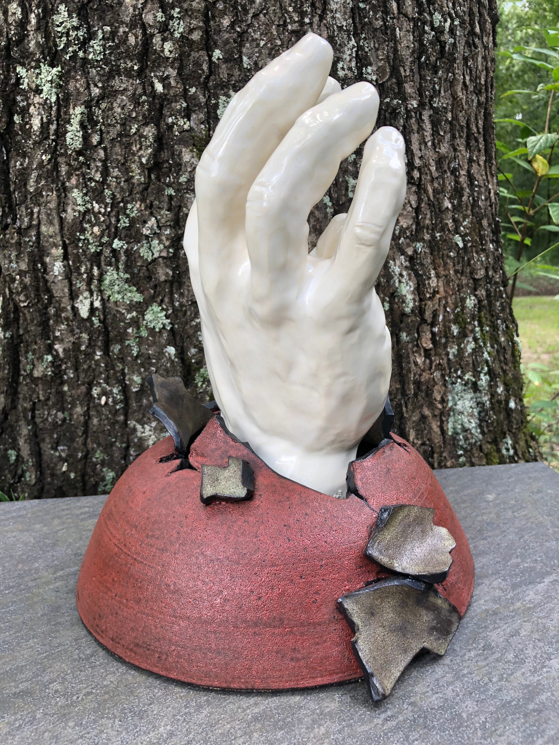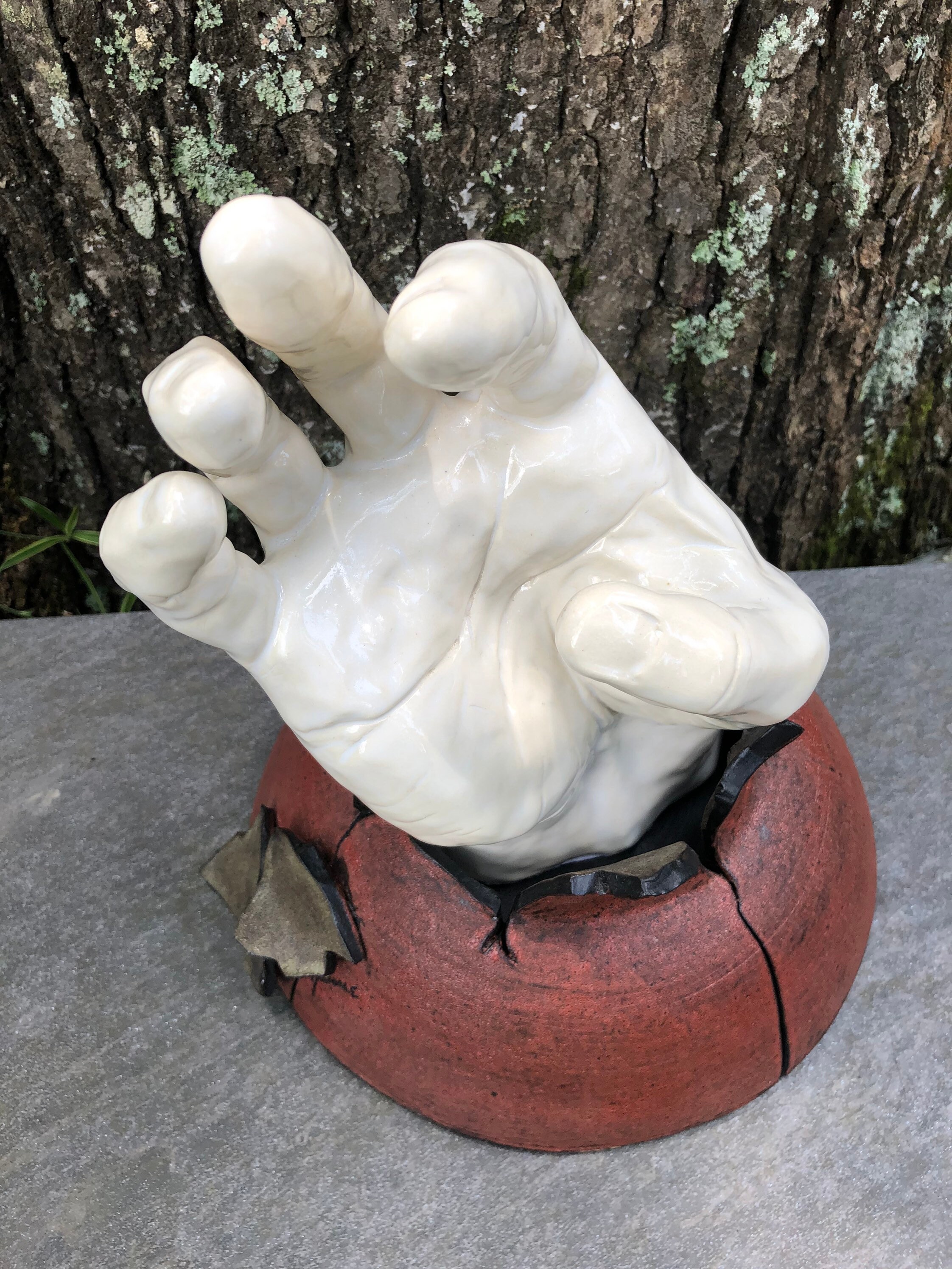 One of a kind sculpture made from fine stoneware clay and glazed. The hand may be displayed erupting forth from the shell, but is equally striking displayed alone. Approximately 12” high