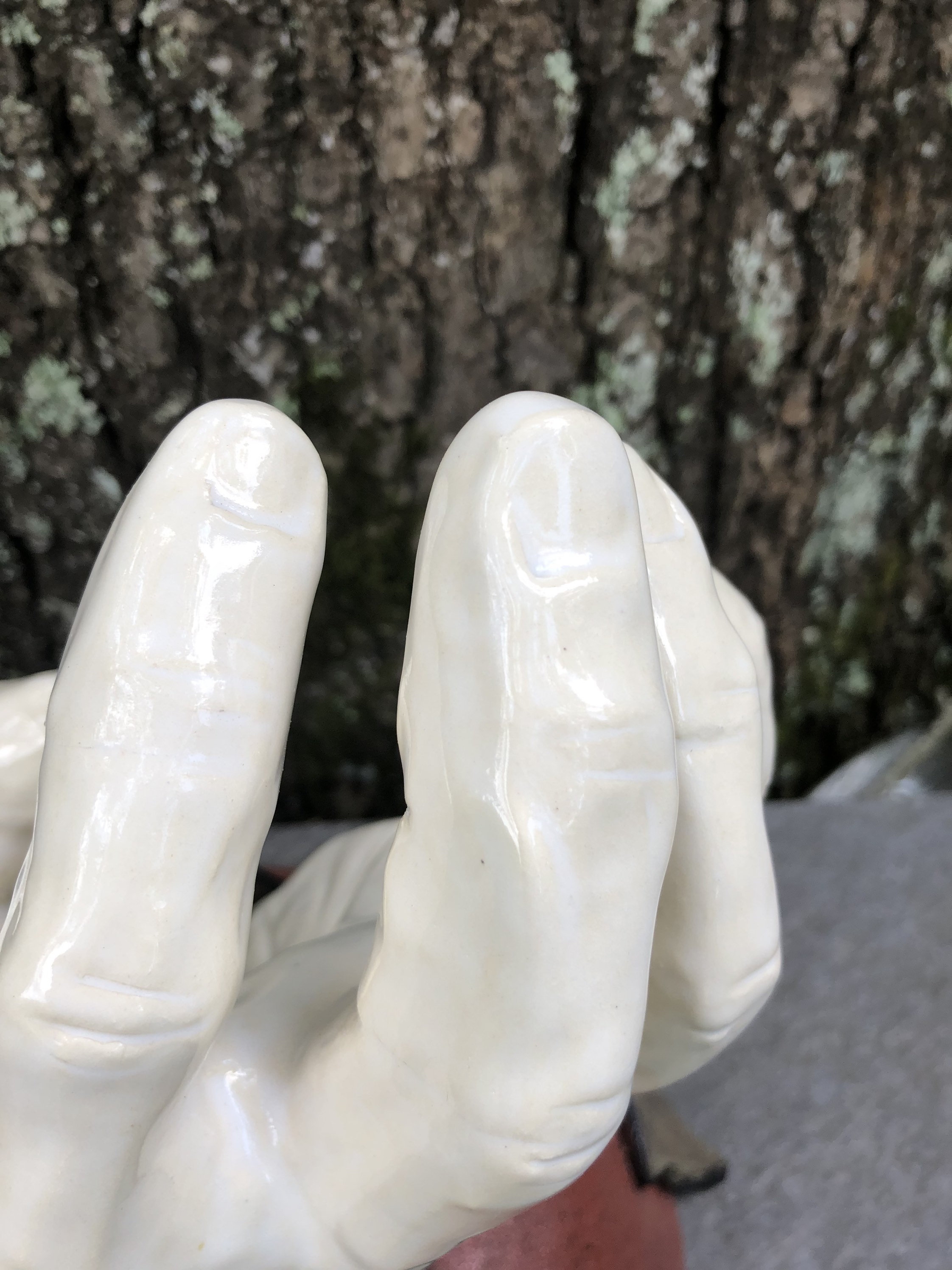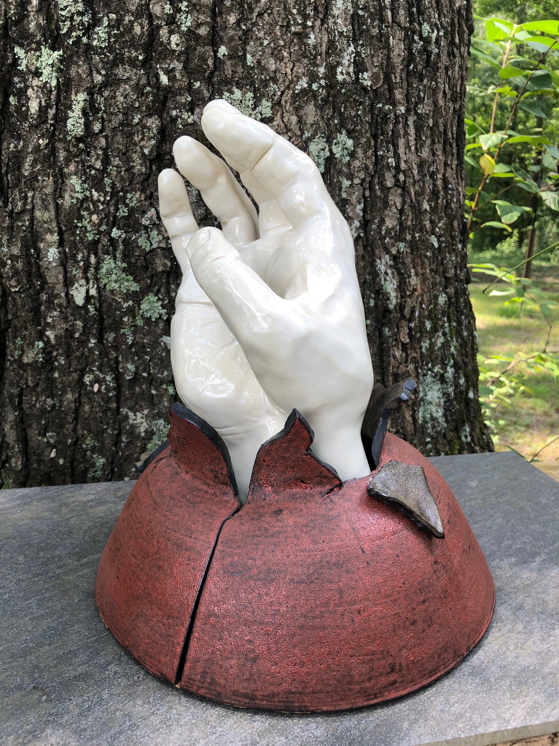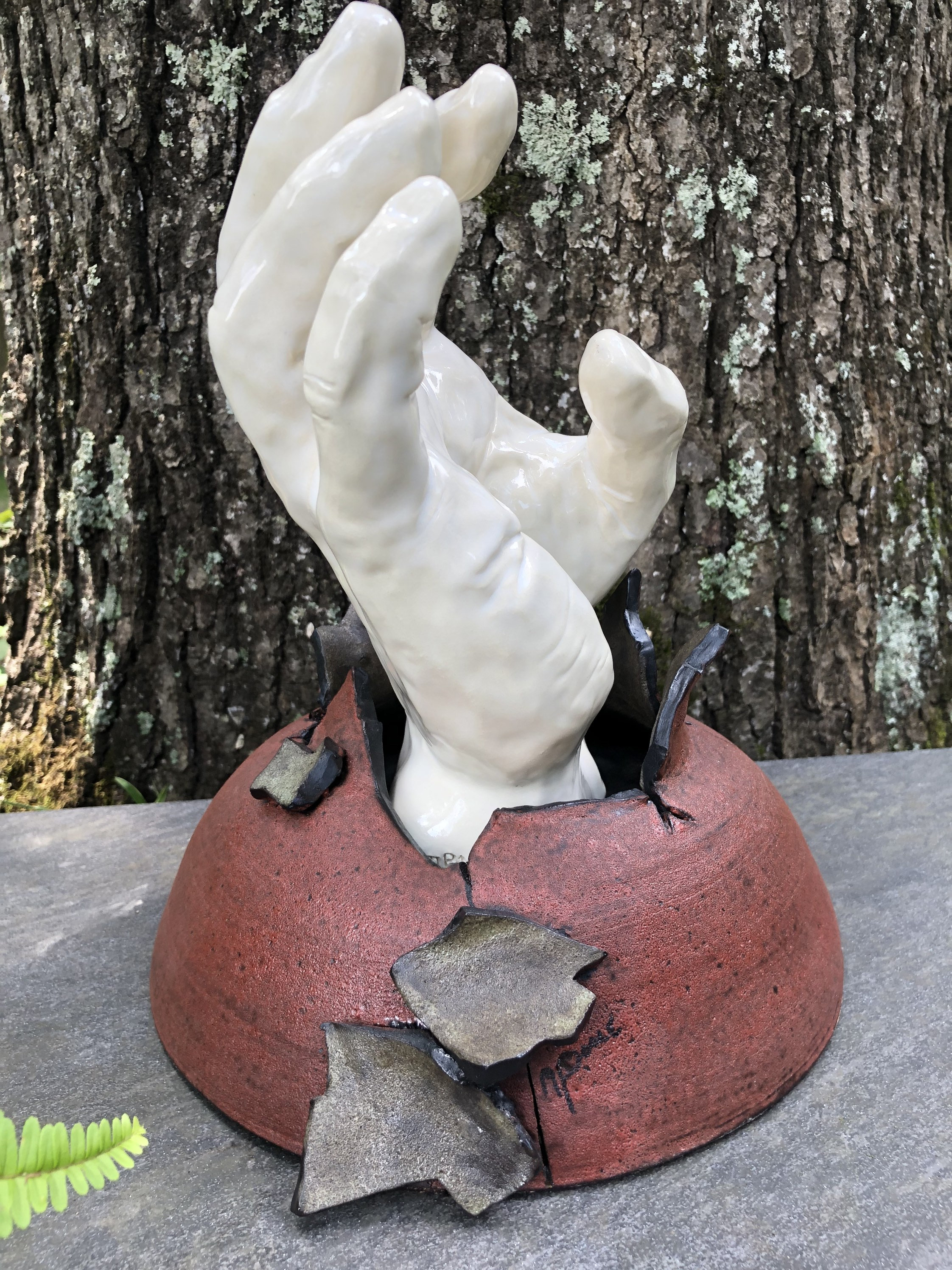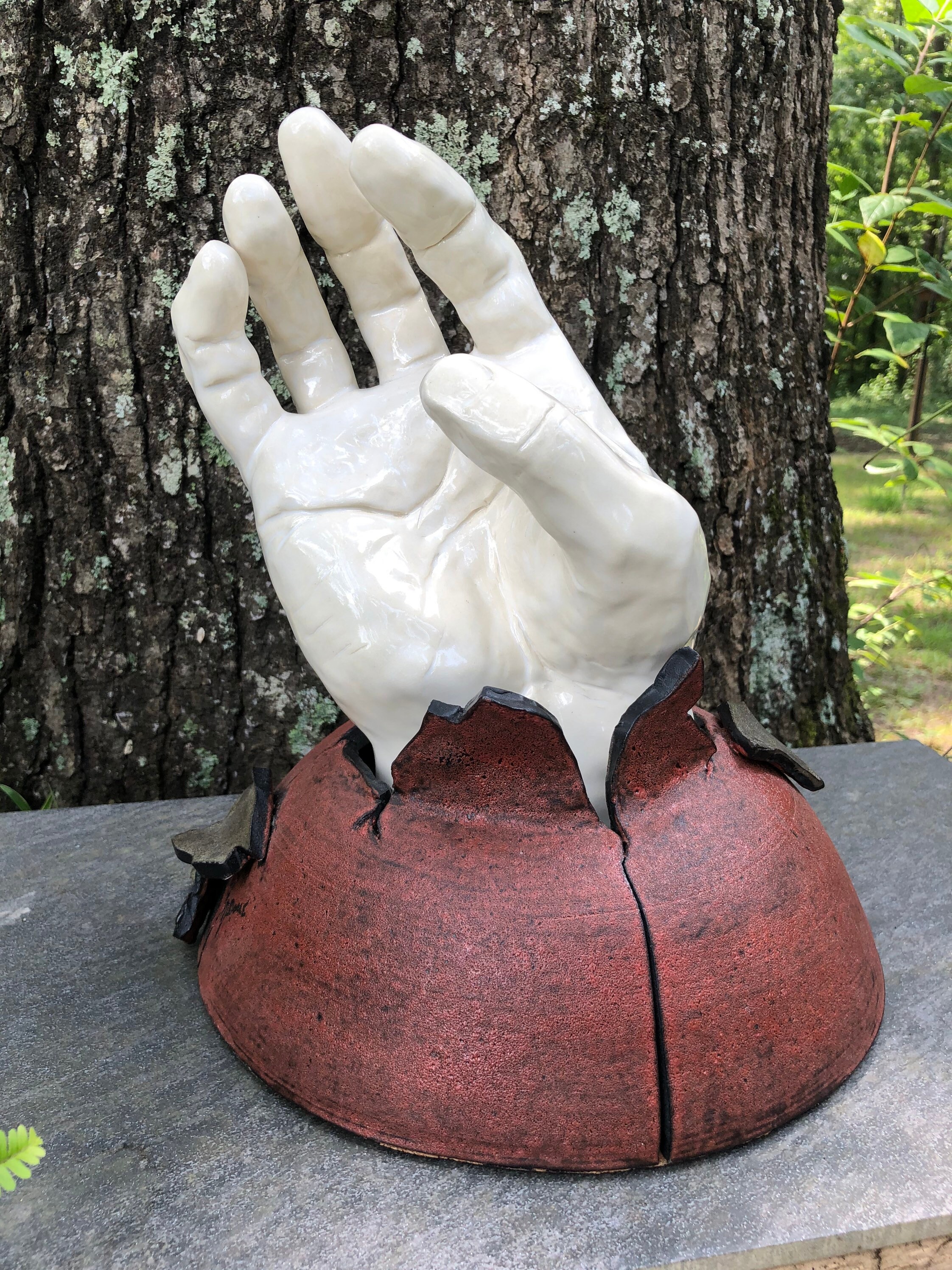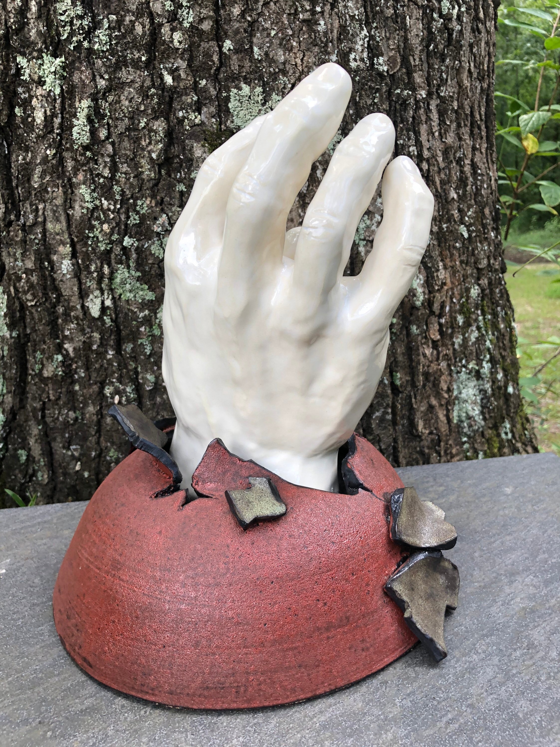 One of a kind sculpture made from fine stoneware clay and glazed. The hand may be displayed erupting forth from the shell, but is equally striking displayed alone. Approximately 12” high