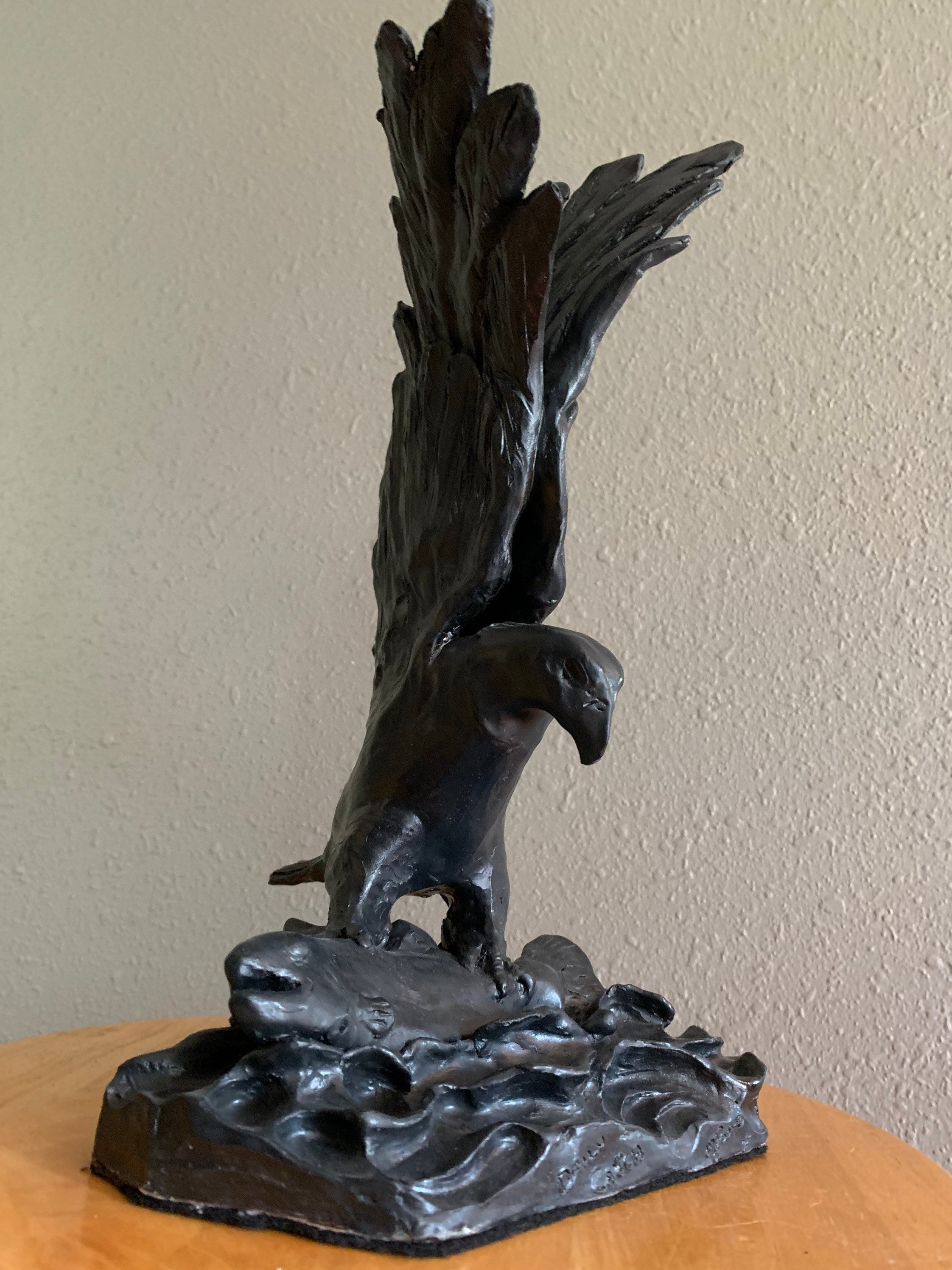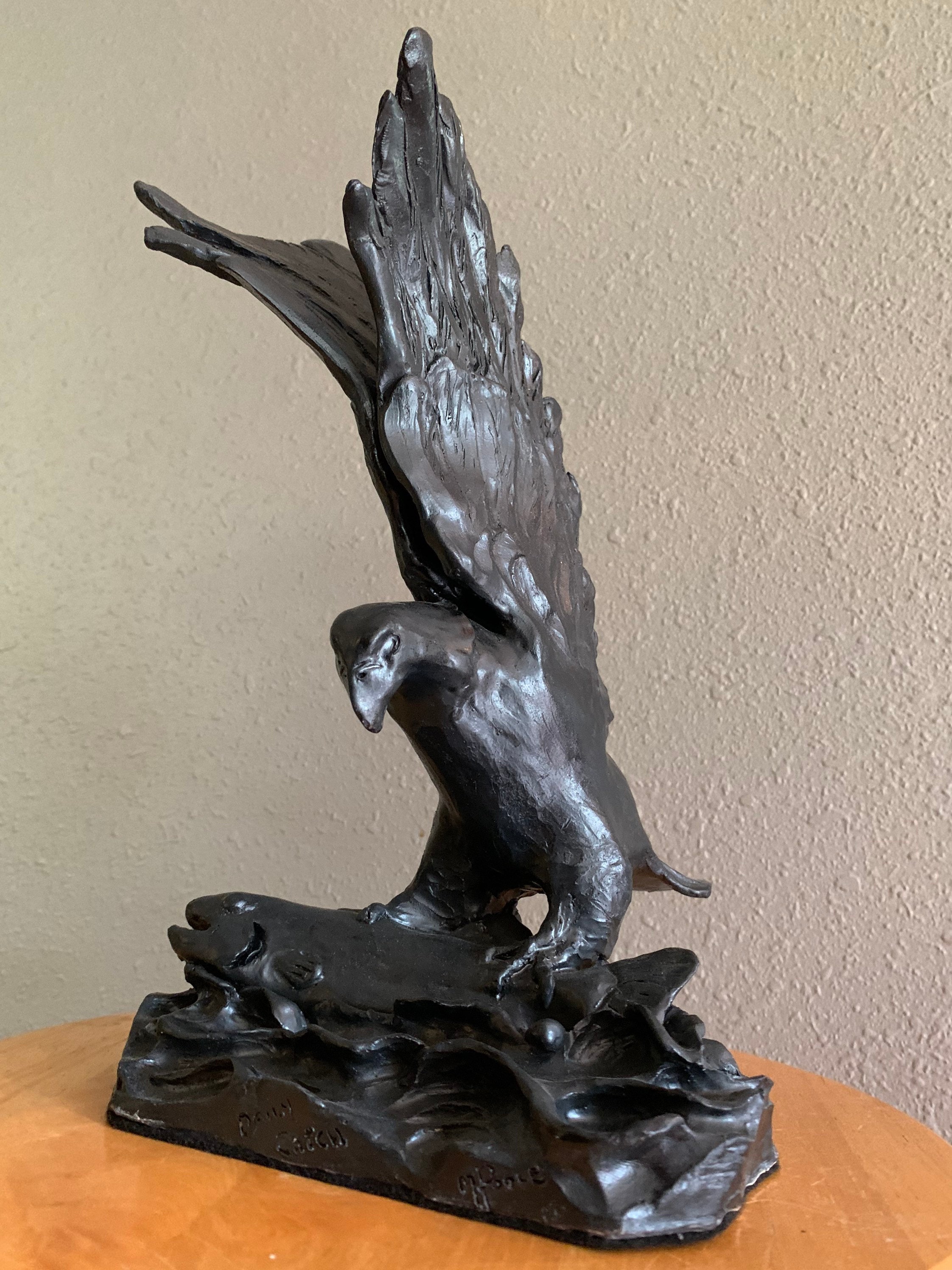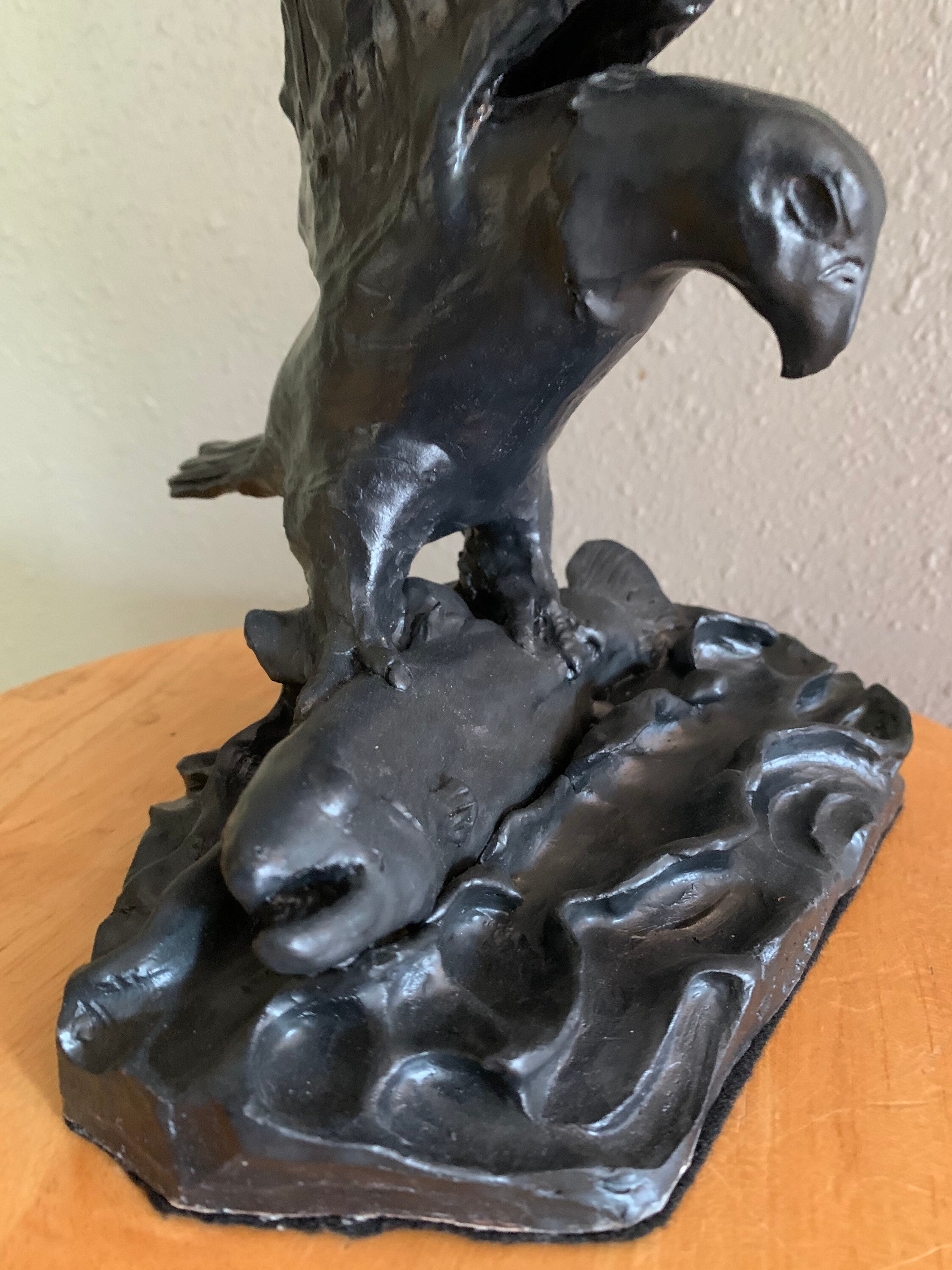 This striking piece was individually sculpted, and is made from fine white stoneware and glazed a lovely satin black. The eagle has caught a large salmon and struggles to lift it from the water.