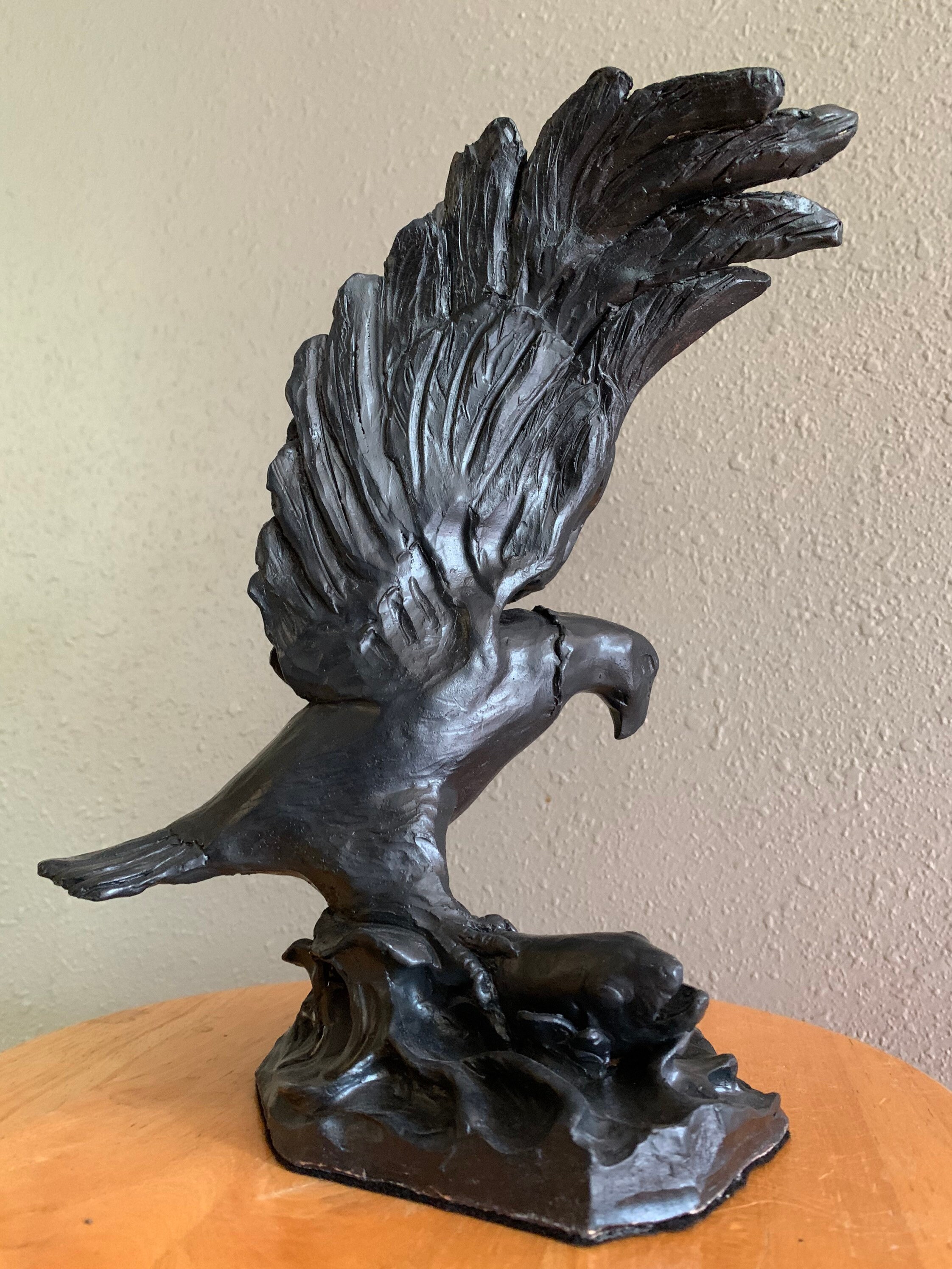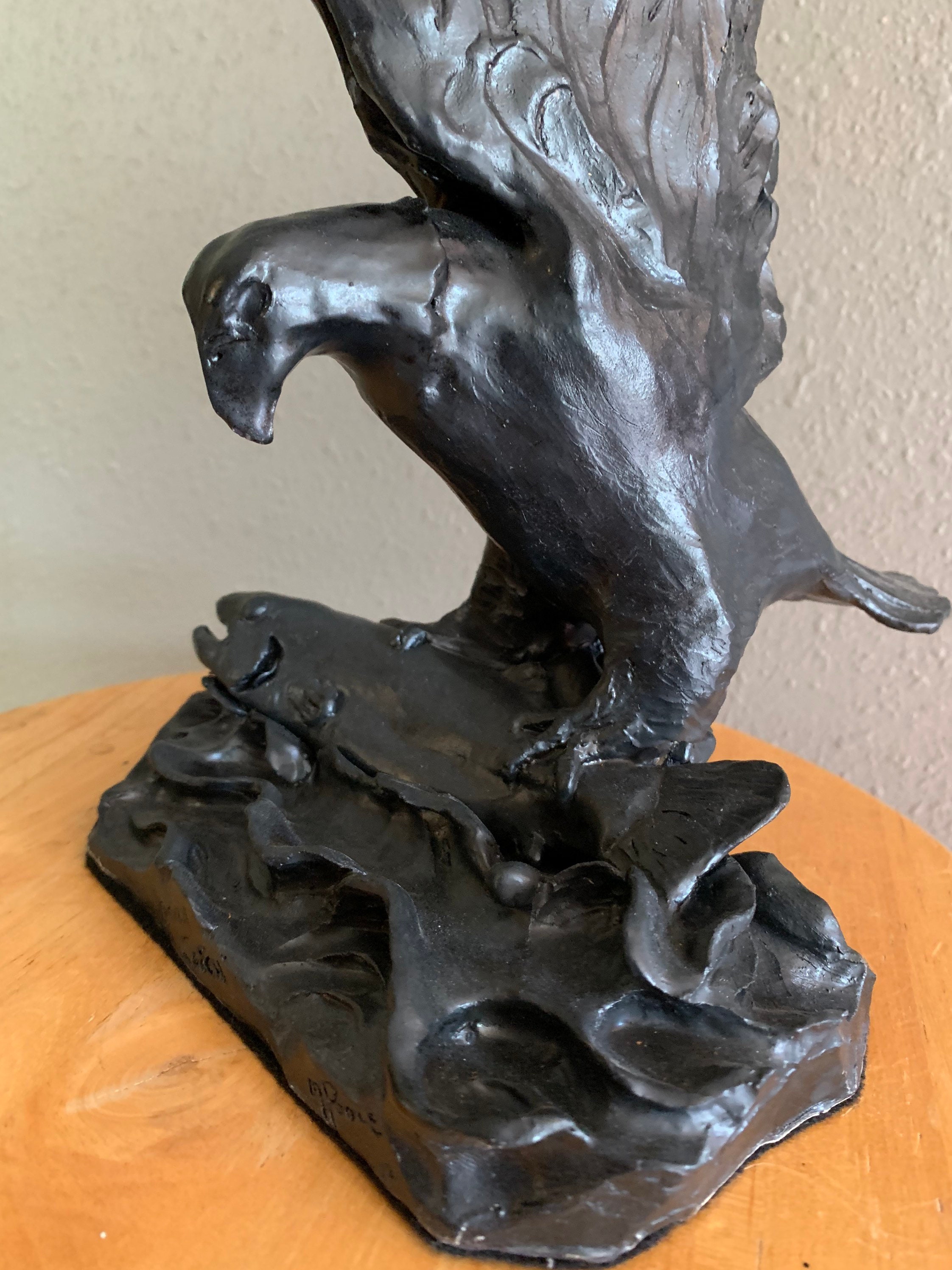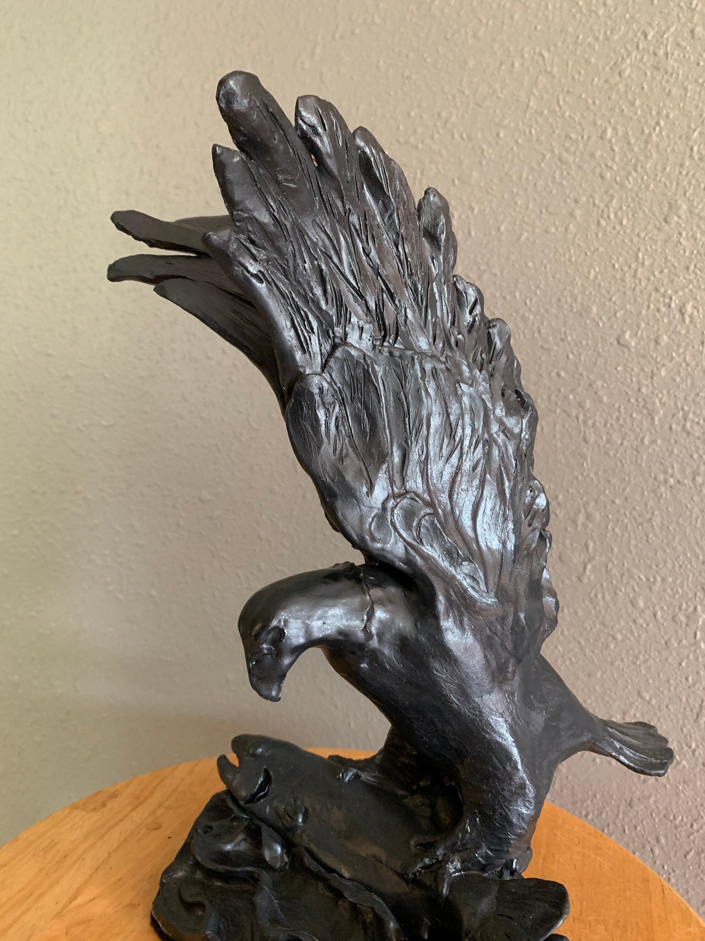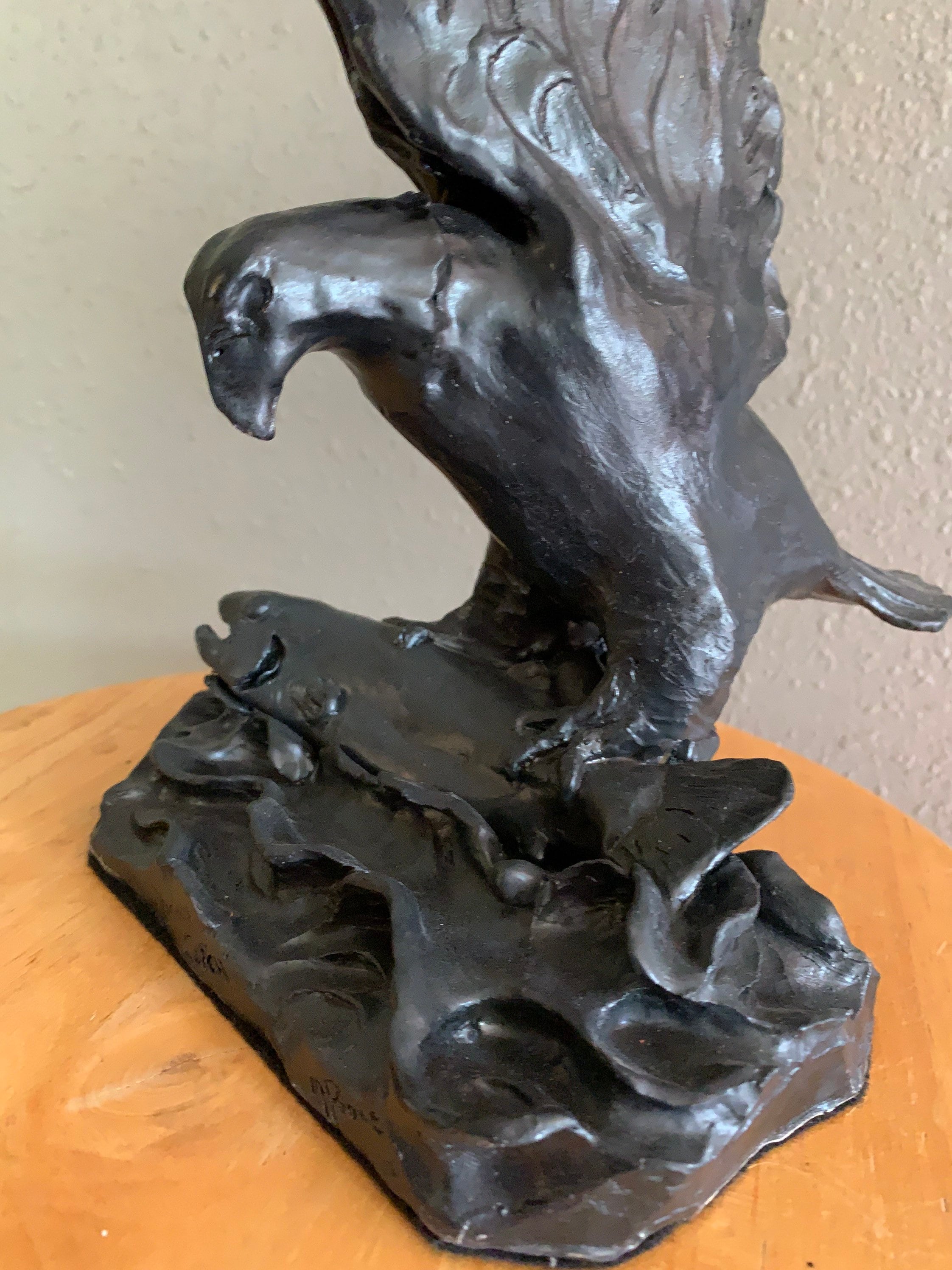 This striking piece was individually sculpted, and is made from fine white stoneware and glazed a lovely satin black. The eagle has caught a large salmon and struggles to lift it from the water.