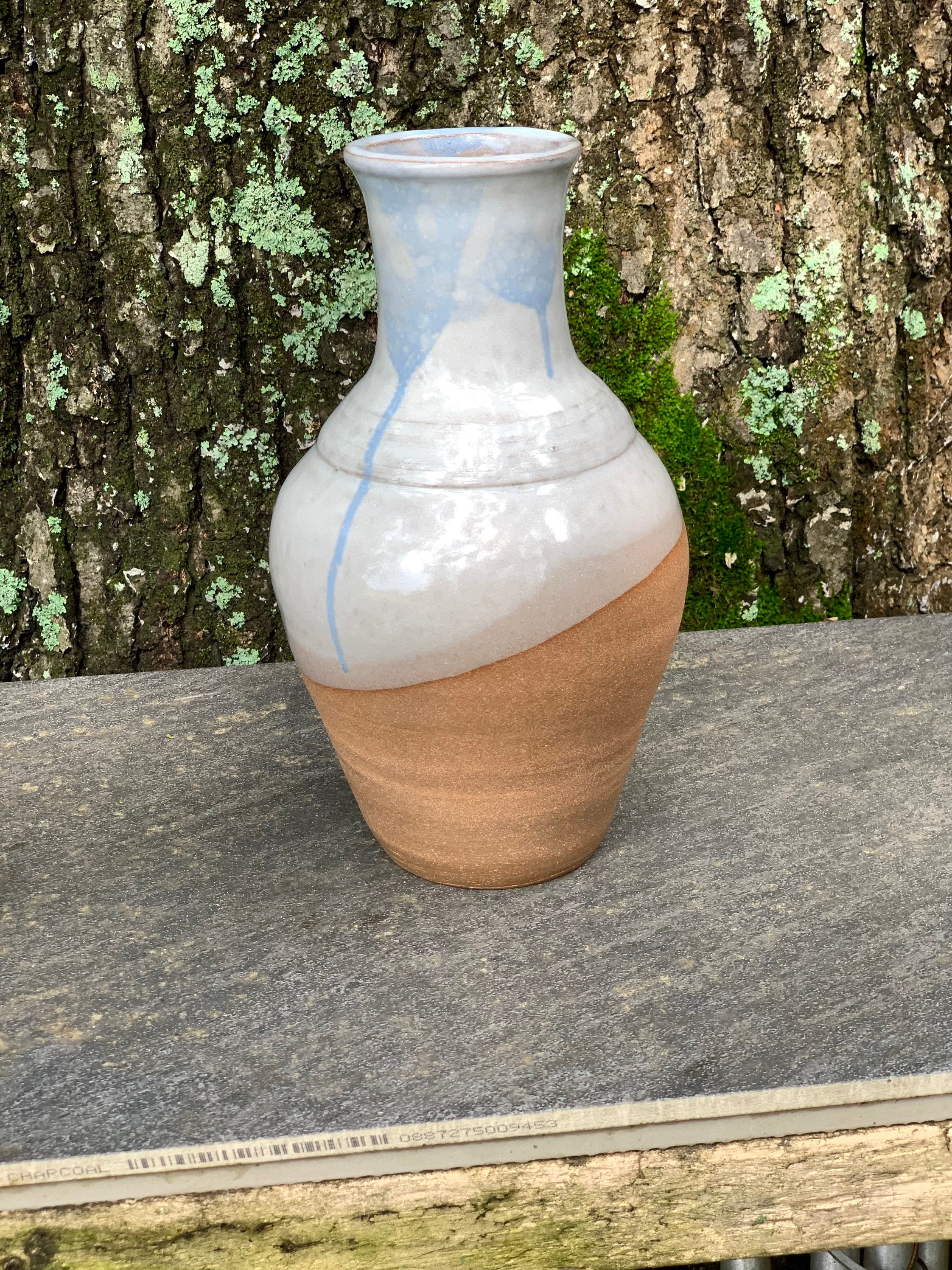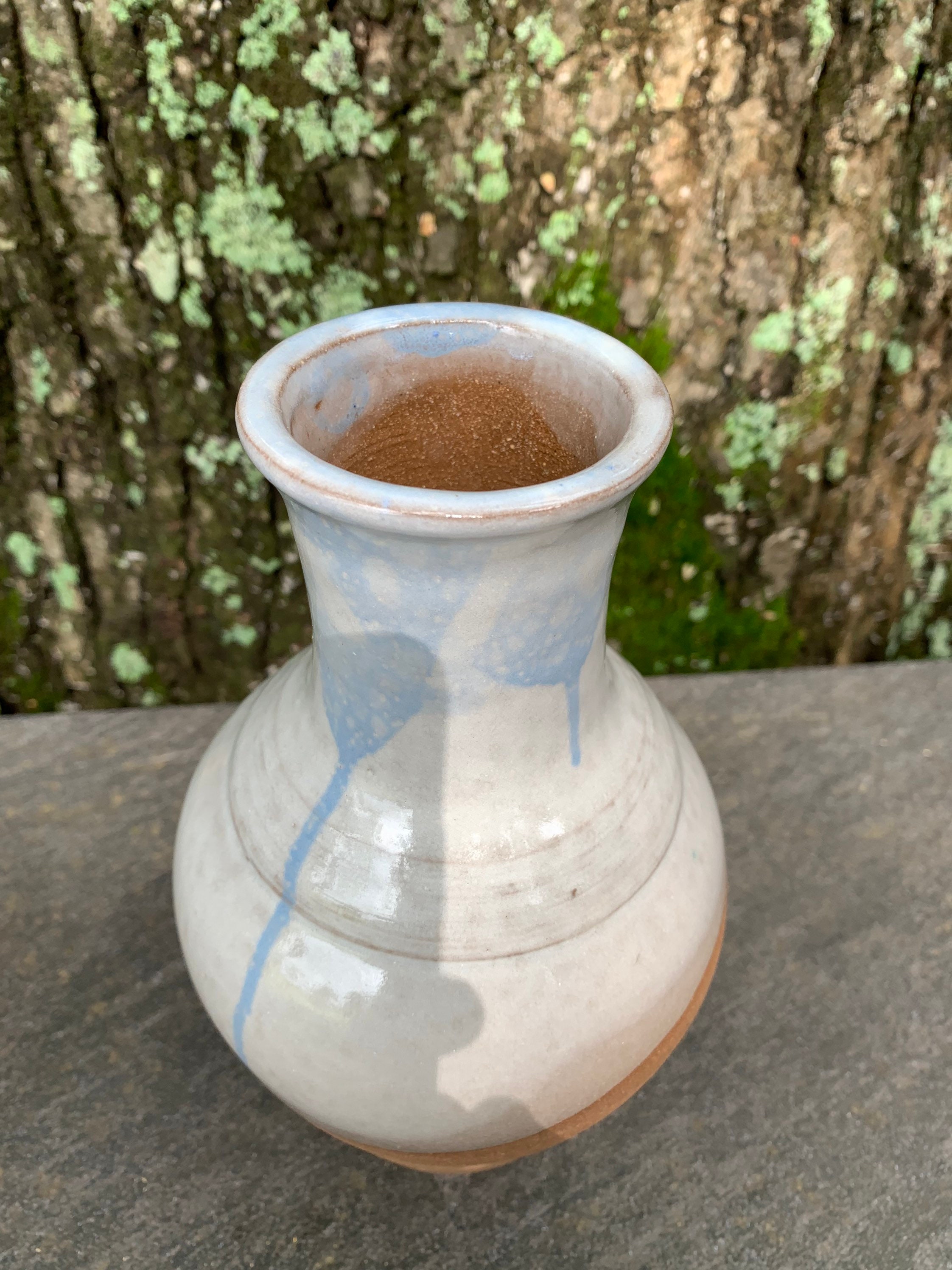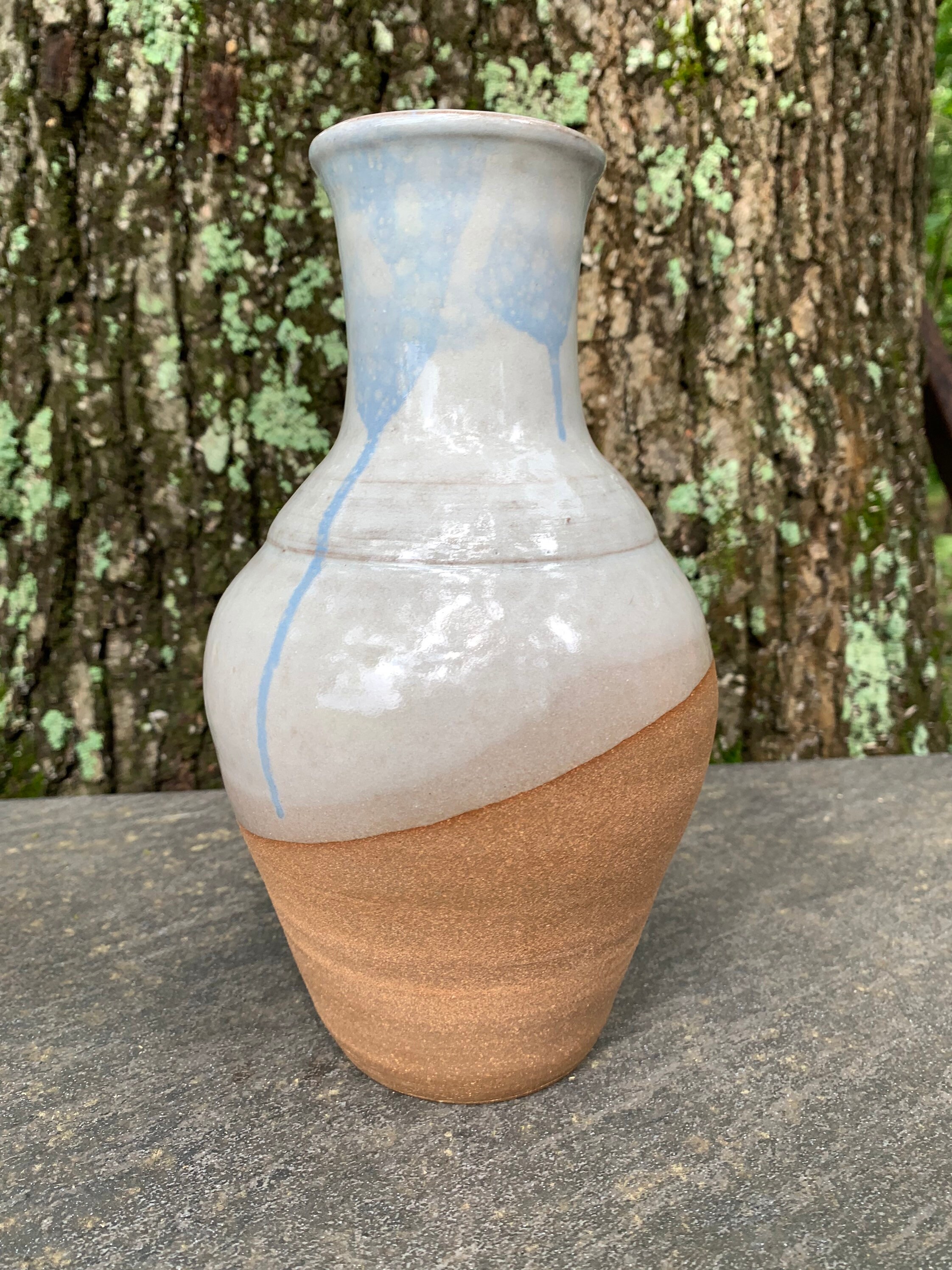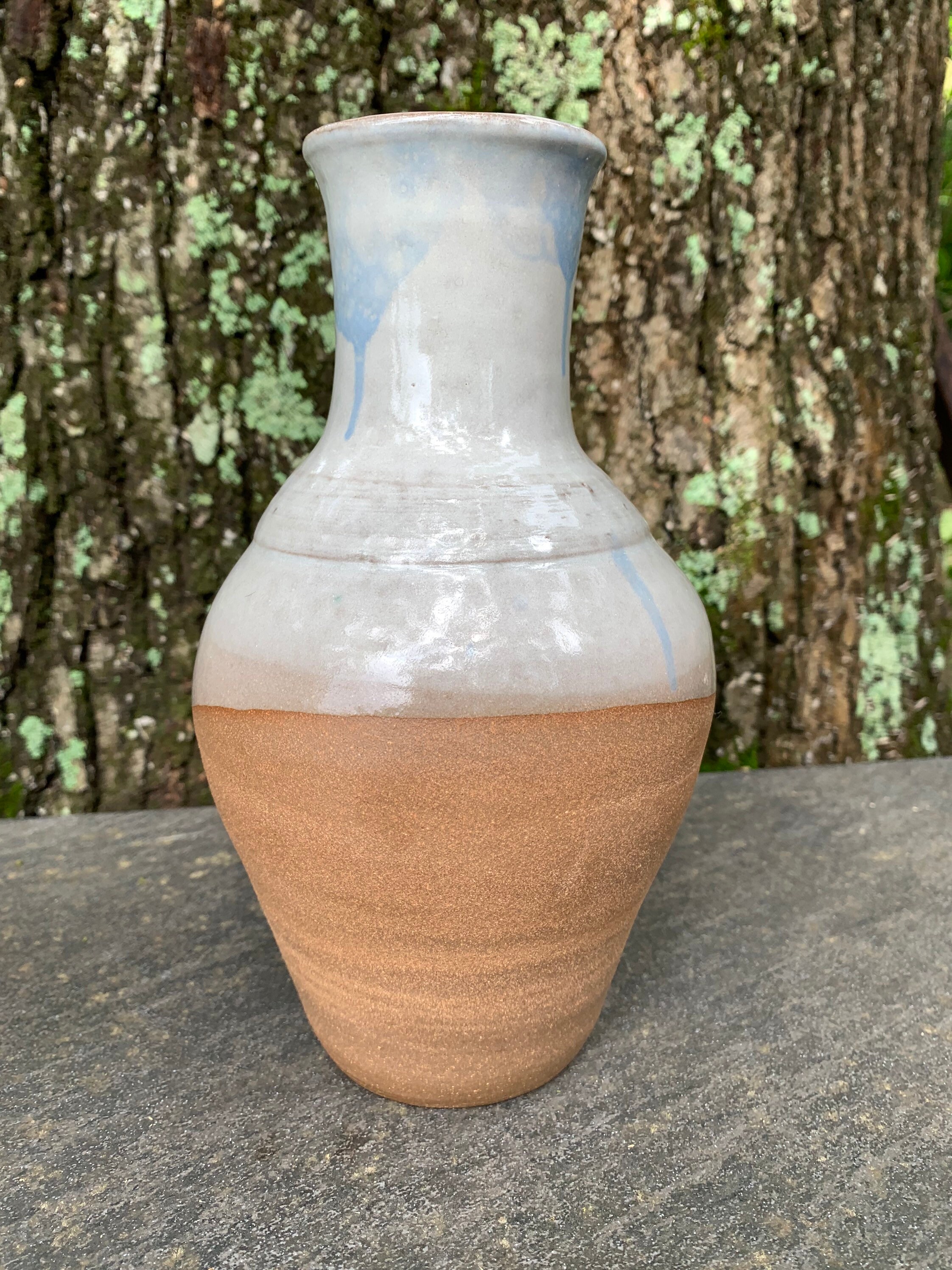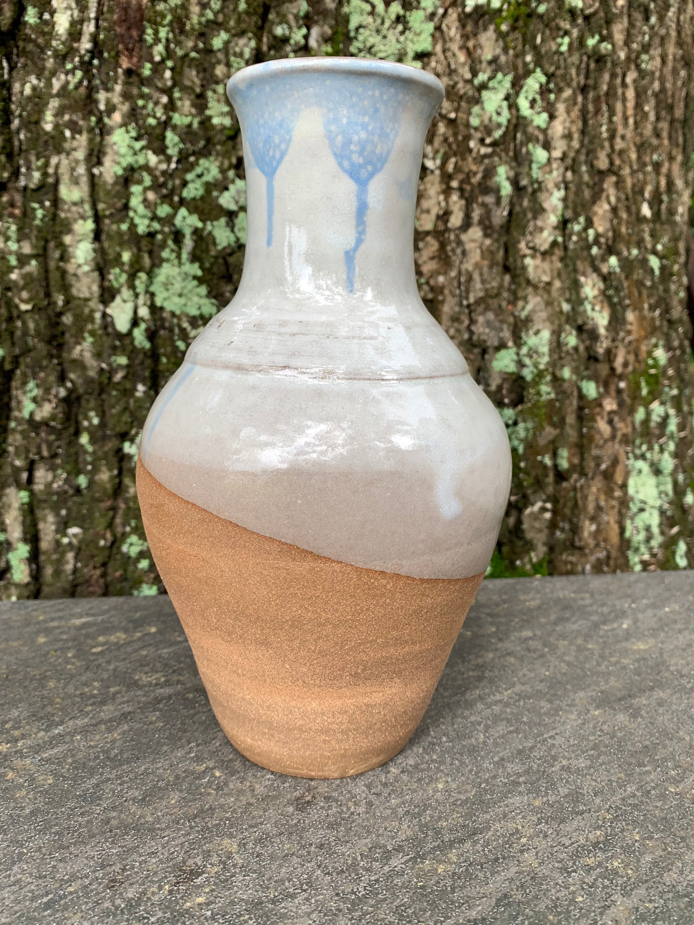 This handsome vase was hand thrown from warm brown stoneware clay and glazed a soft Ivory white, with hints of blue cascading from the rim. Stands 9” high.