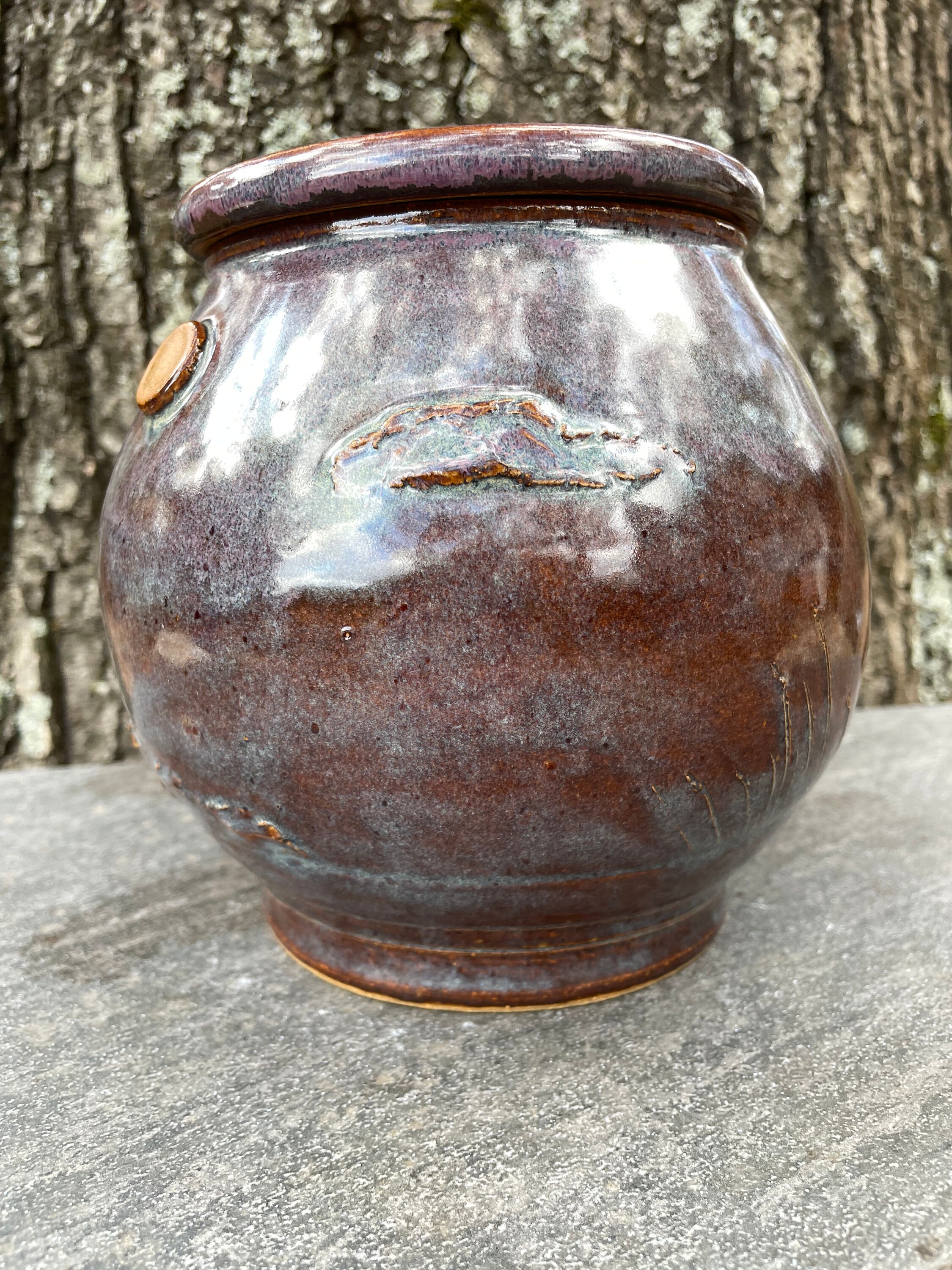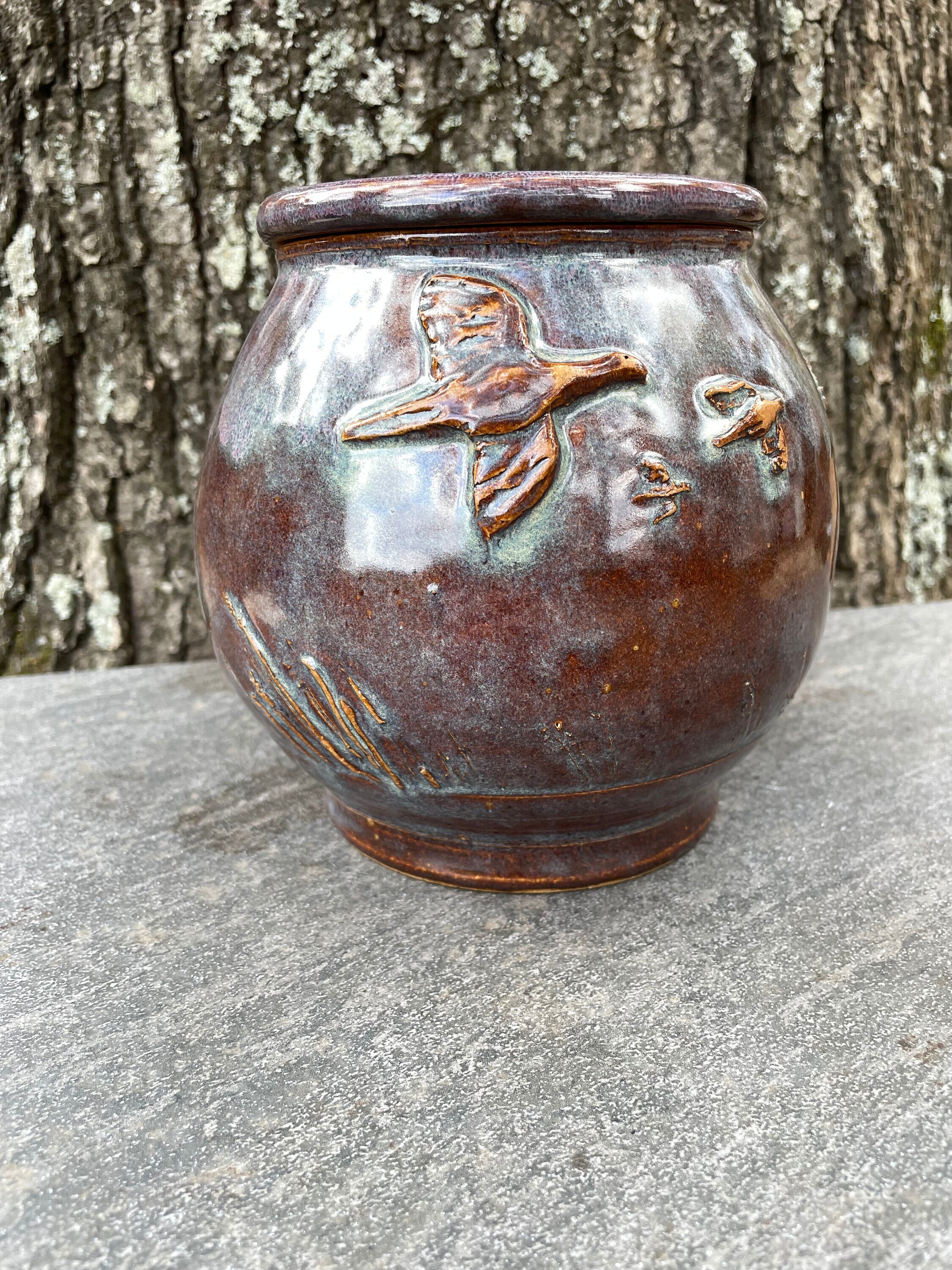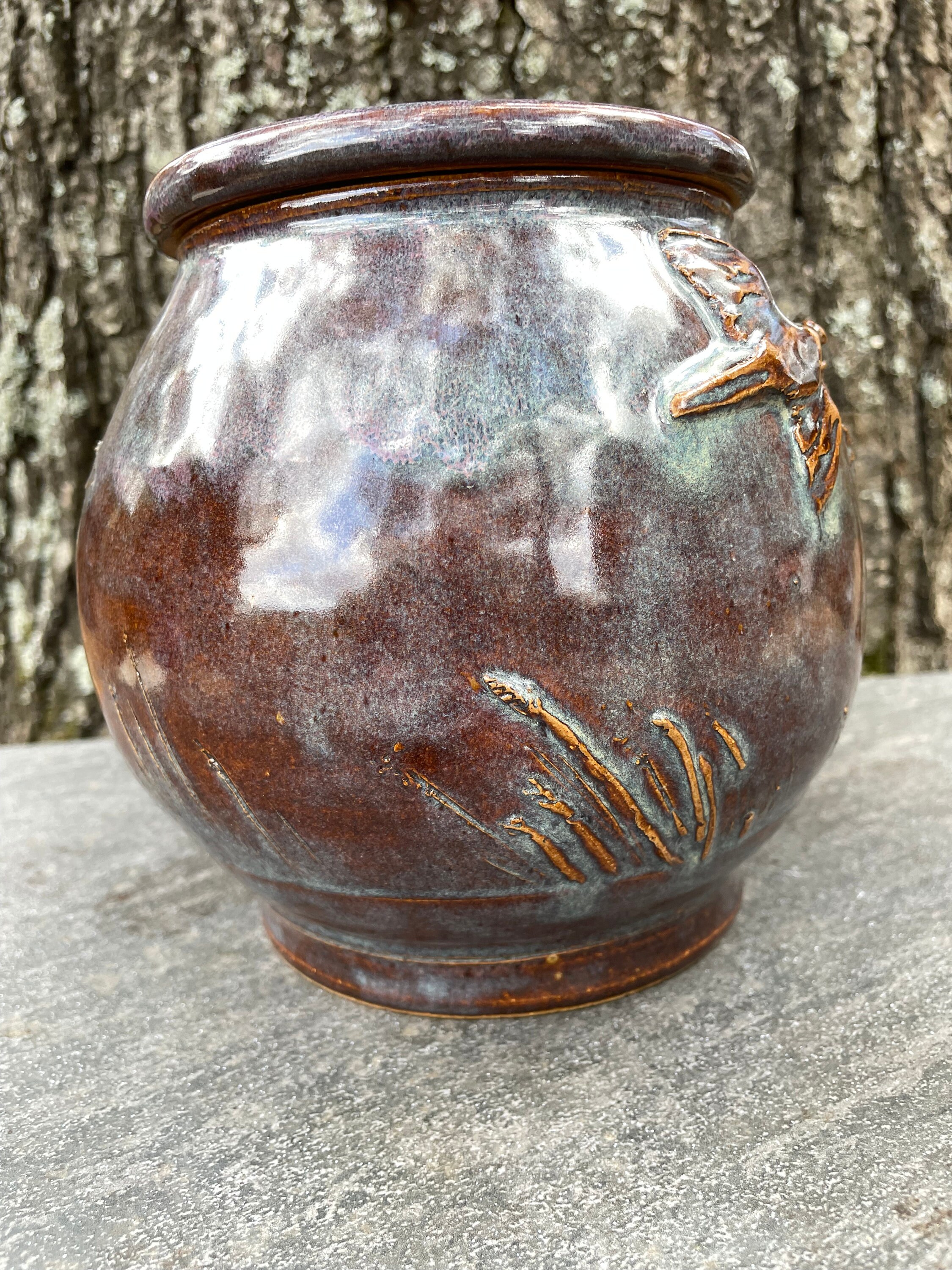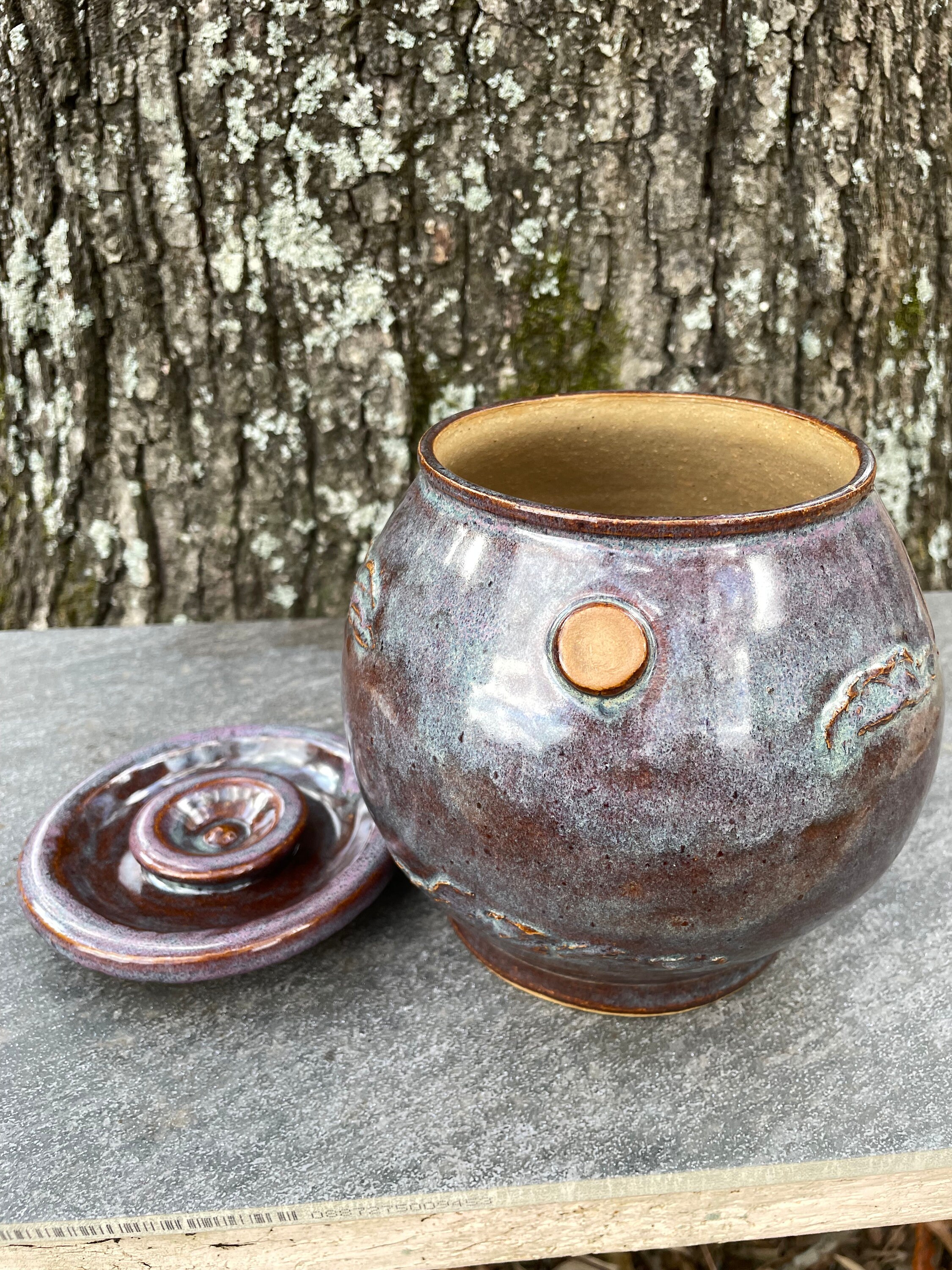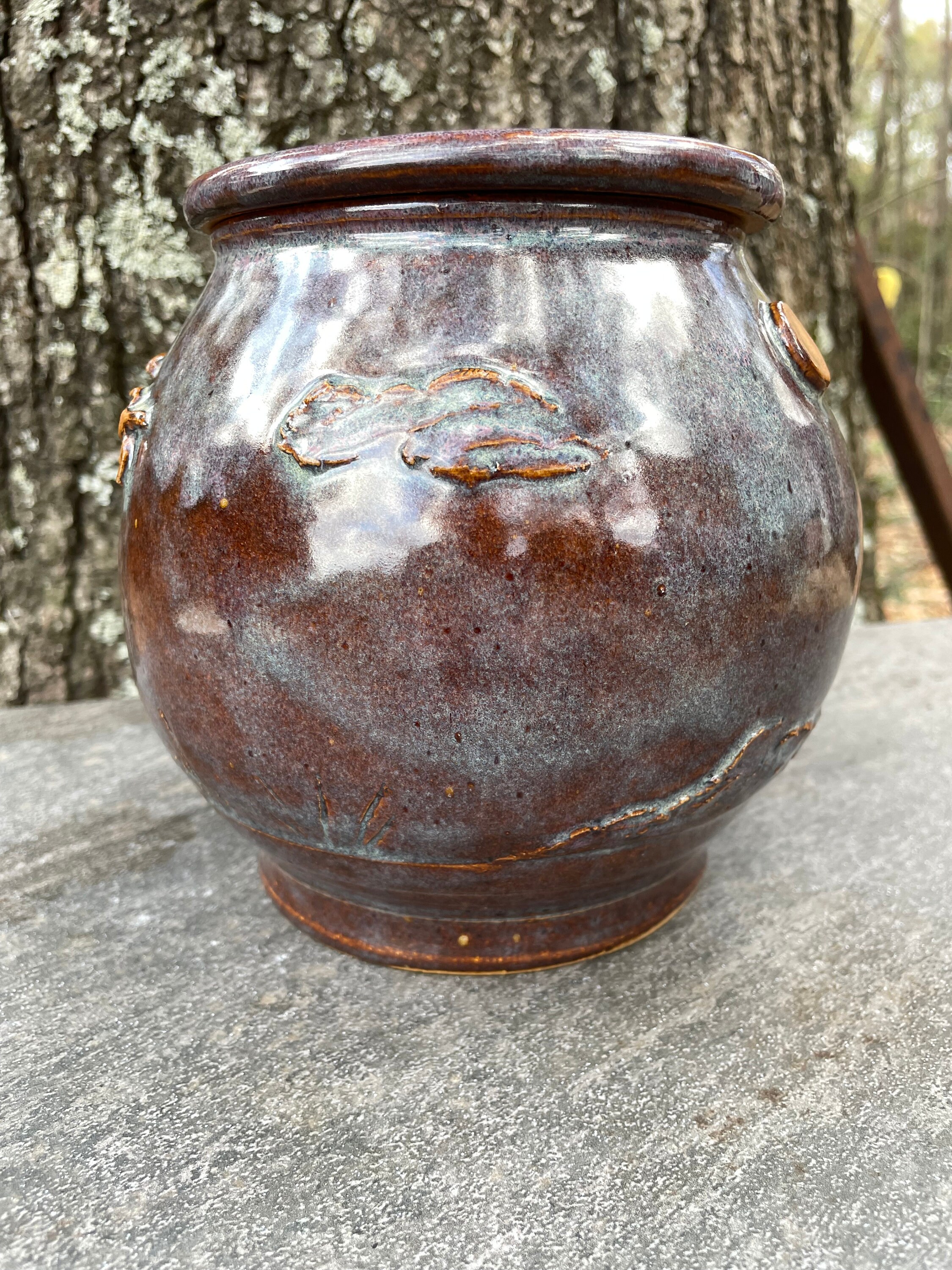 This beautifully unique canister was was hand thrown from warm brown stoneware clay and then the details of pheasant, sun, clouds, and prairie grass were added by hand. The glazes have hues of purple, blue, violet, and brown. The inside is glazed clear and will hold water, but this might best be used for dry goods like cookies, candies, tea bags, pipe tobacco, etc. the lid fits snuggly, but it does not have an added seal.