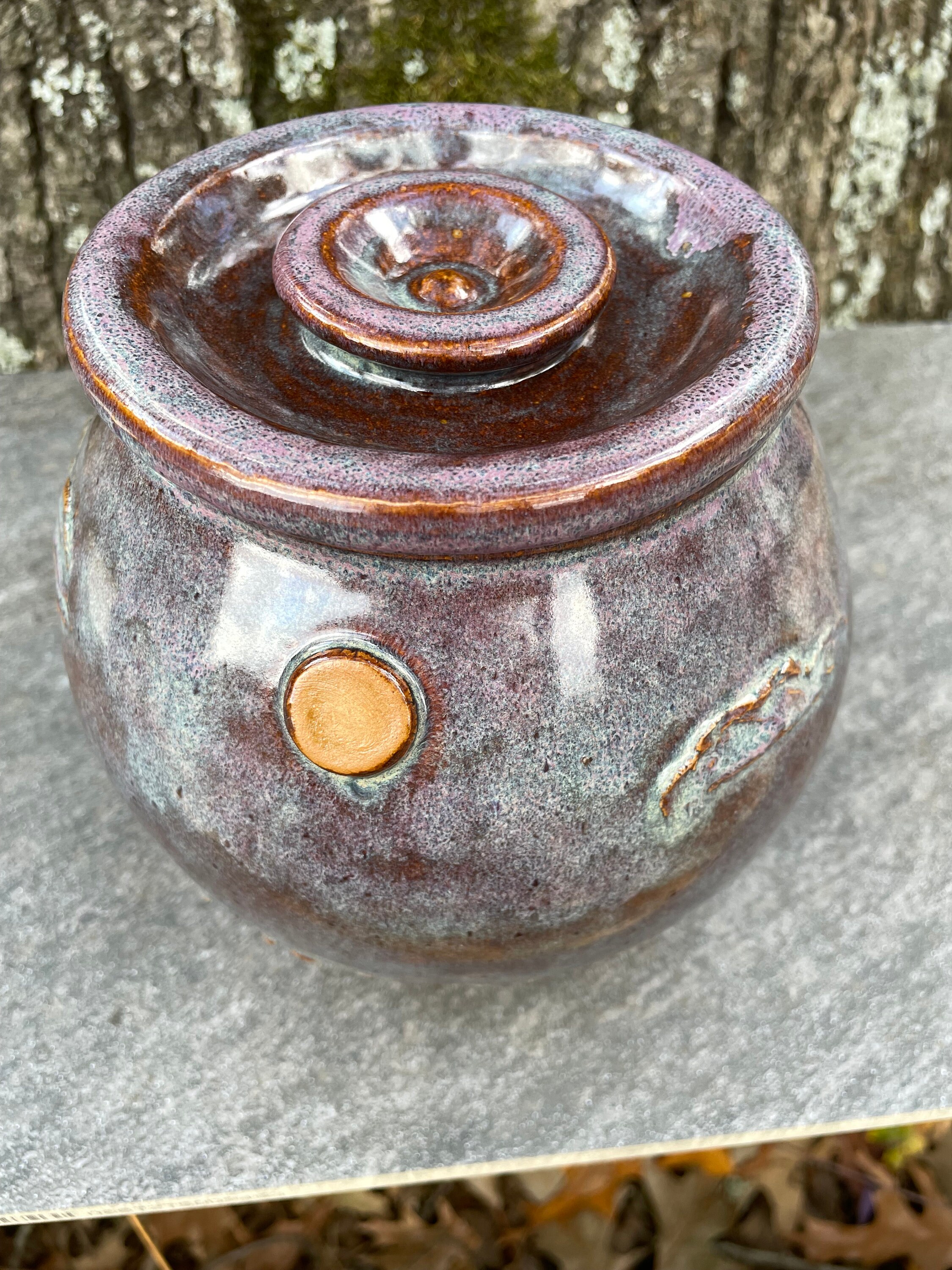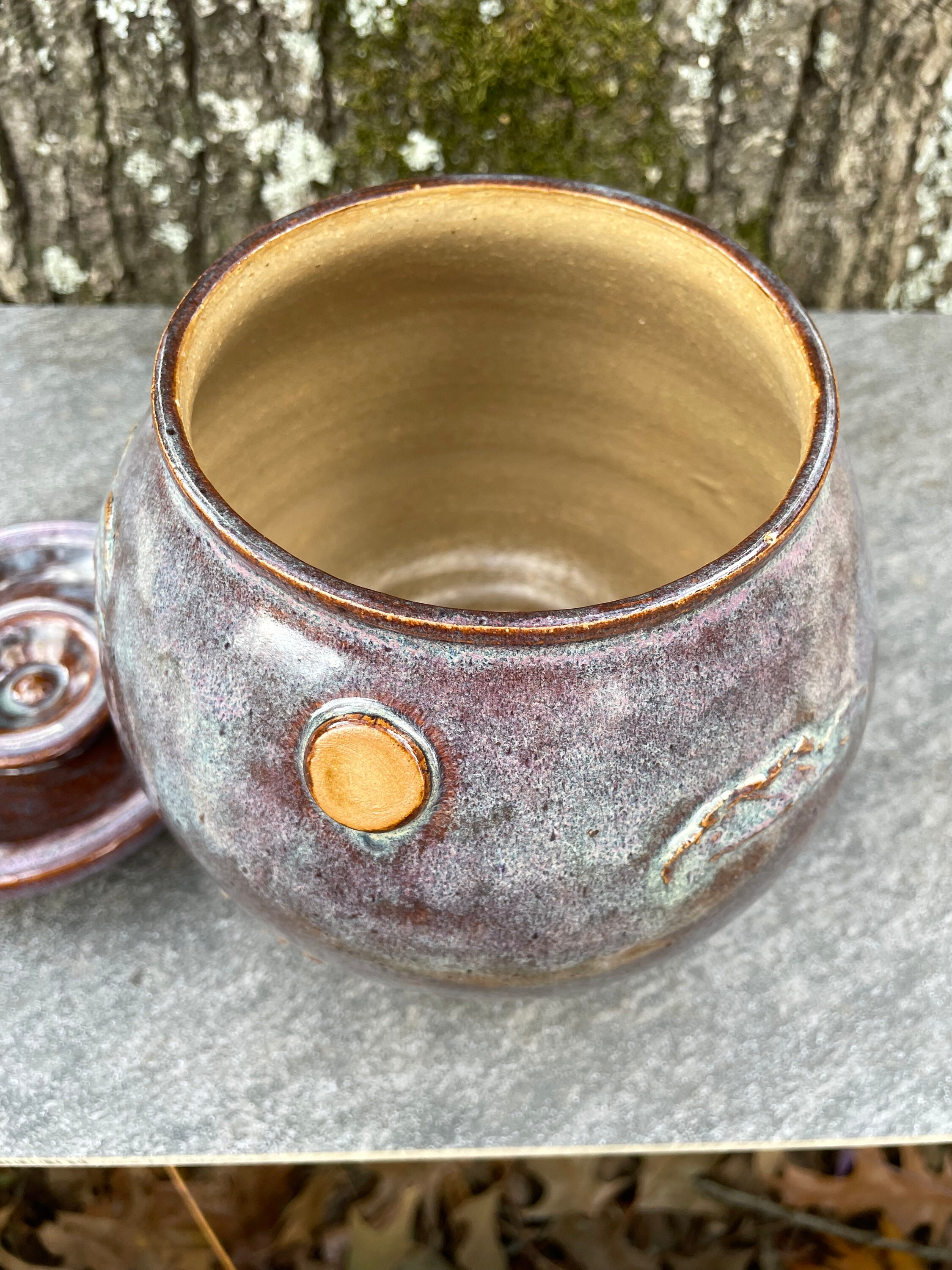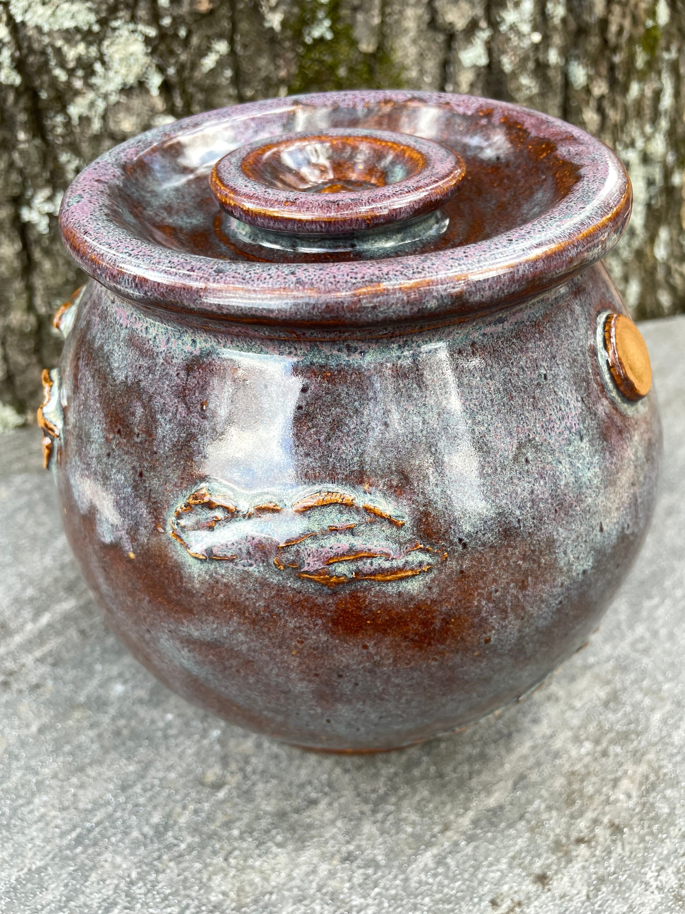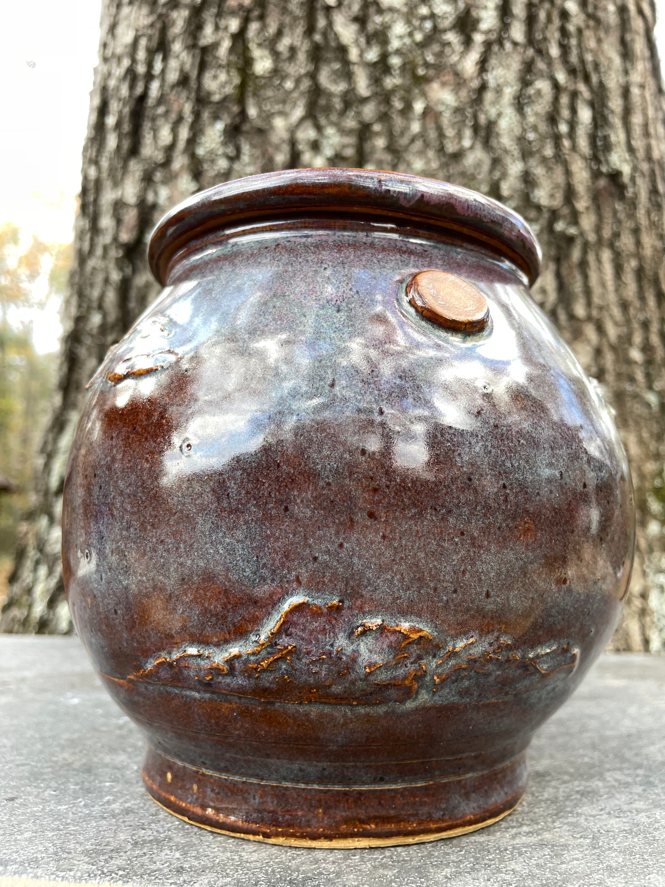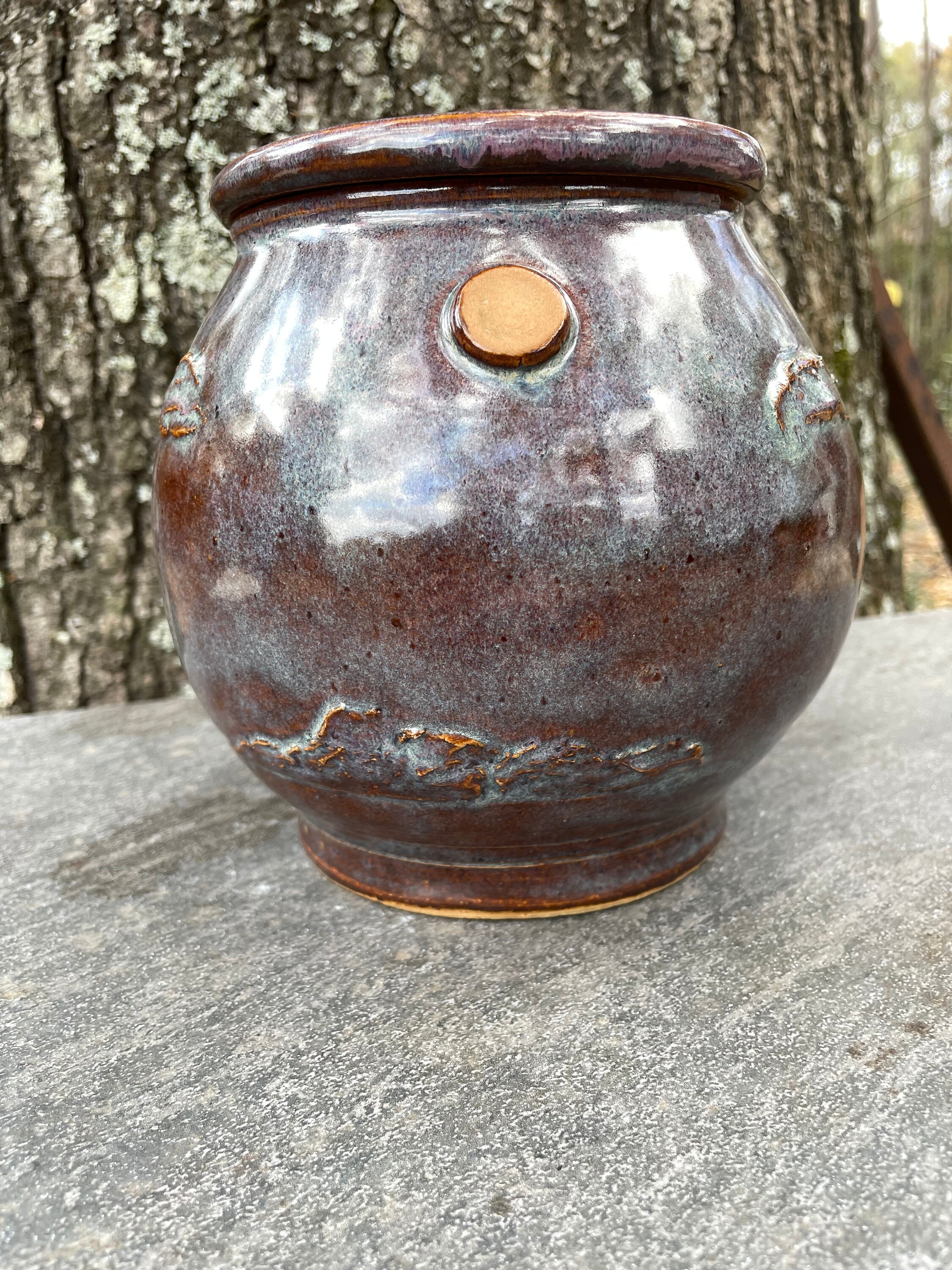 This beautifully unique canister was was hand thrown from warm brown stoneware clay and then the details of pheasant, sun, clouds, and prairie grass were added by hand. The glazes have hues of purple, blue, violet, and brown. The inside is glazed clear and will hold water, but this might best be used for dry goods like cookies, candies, tea bags, pipe tobacco, etc. the lid fits snuggly, but it does not have an added seal.