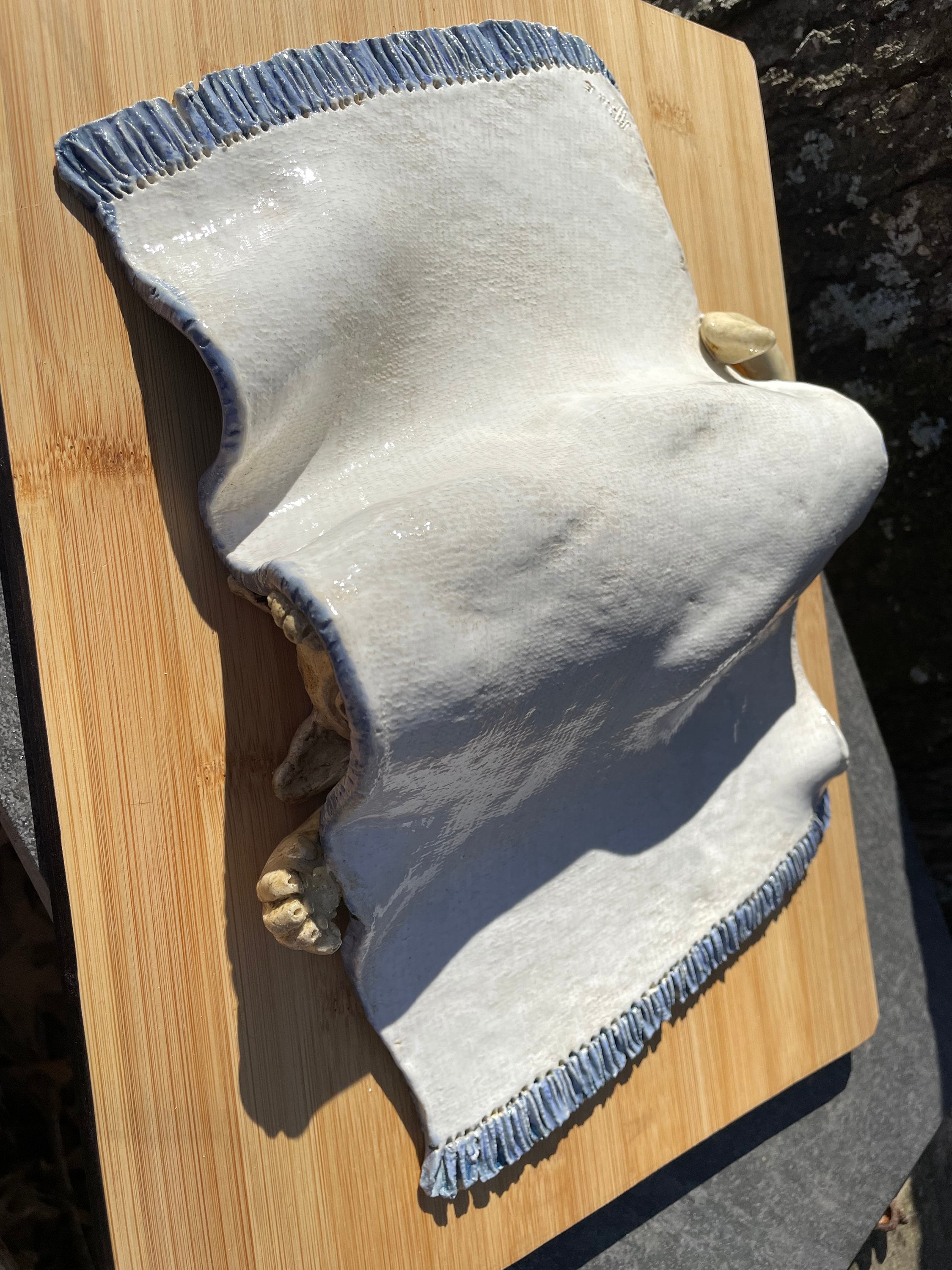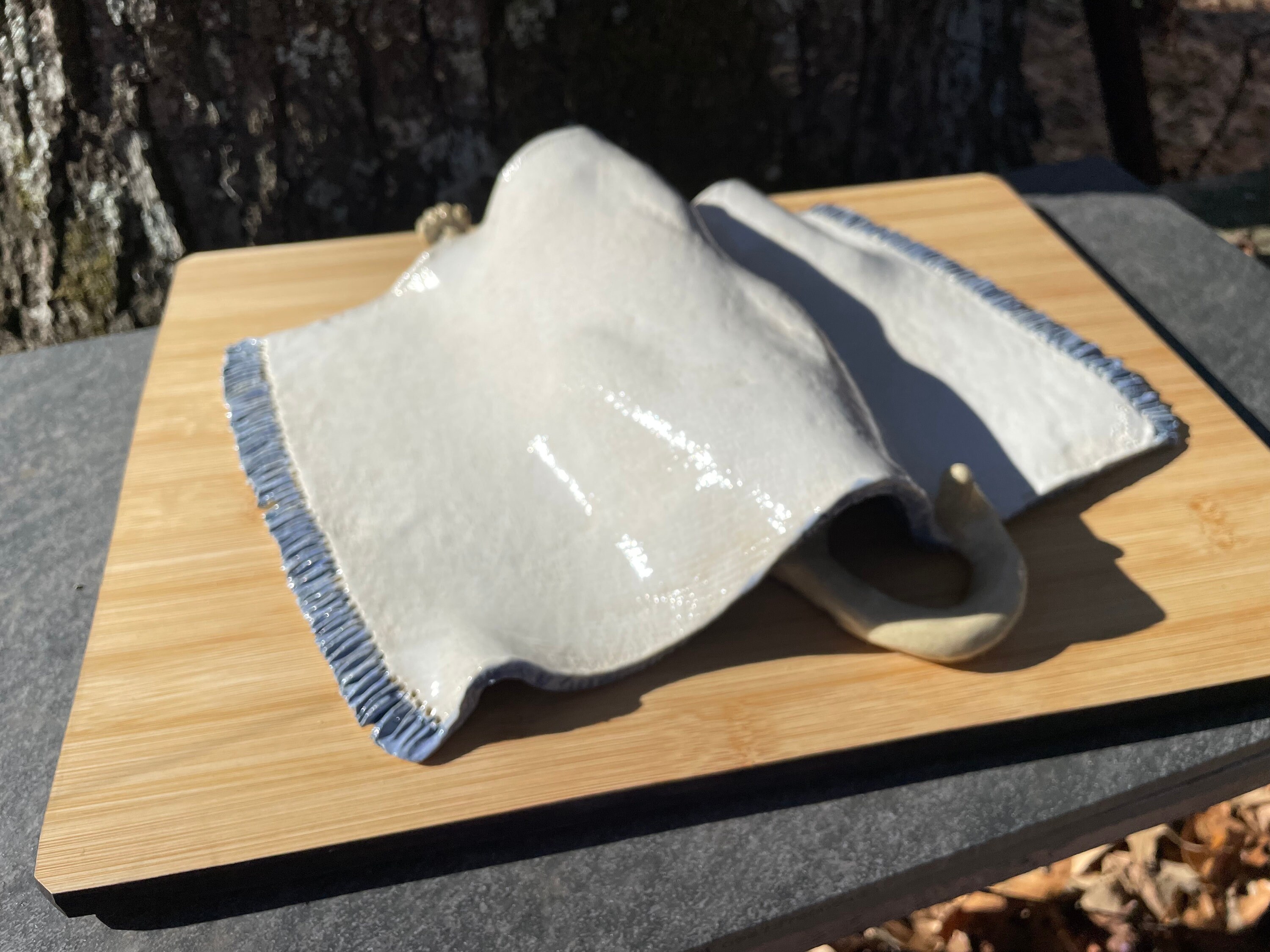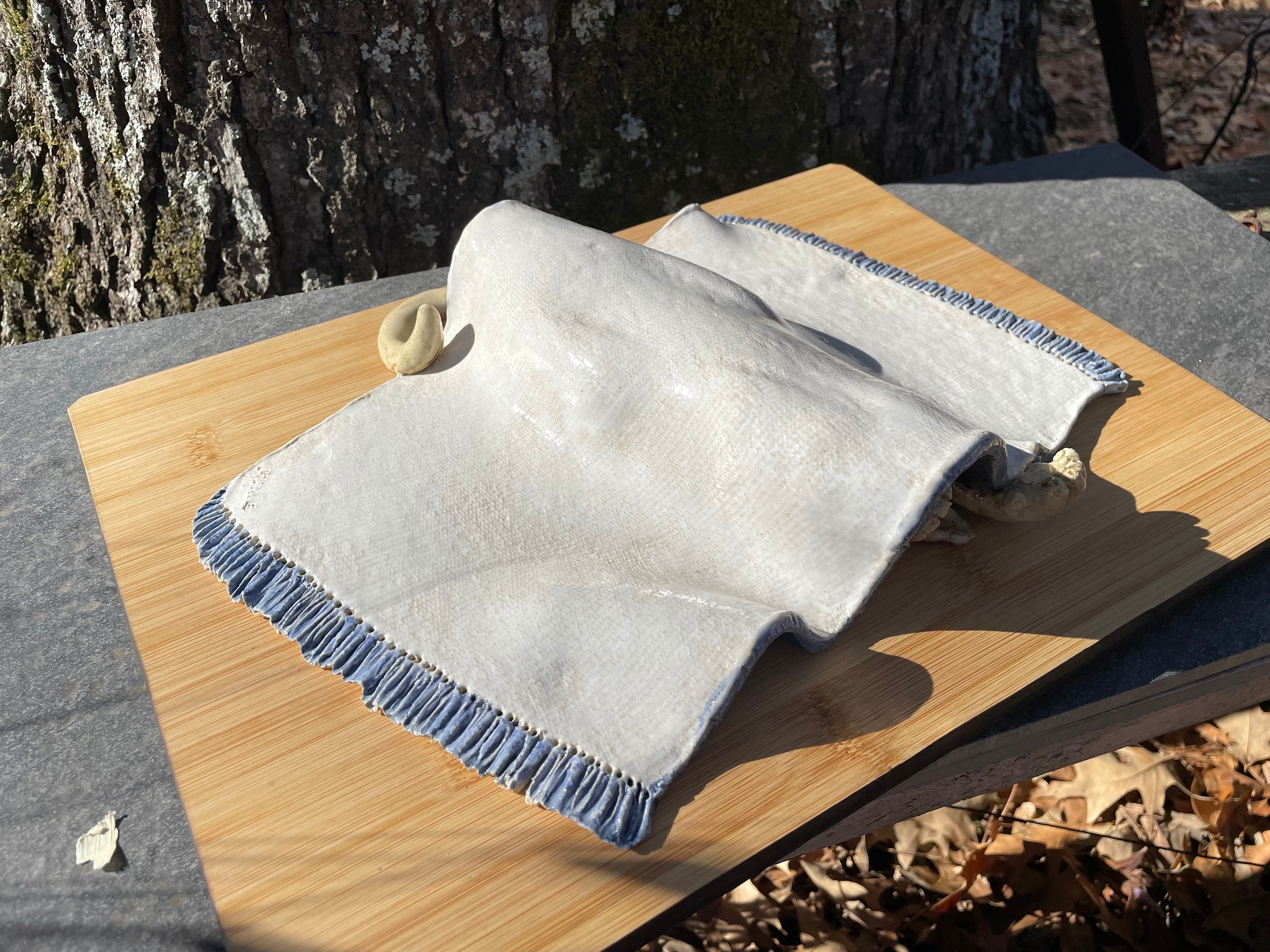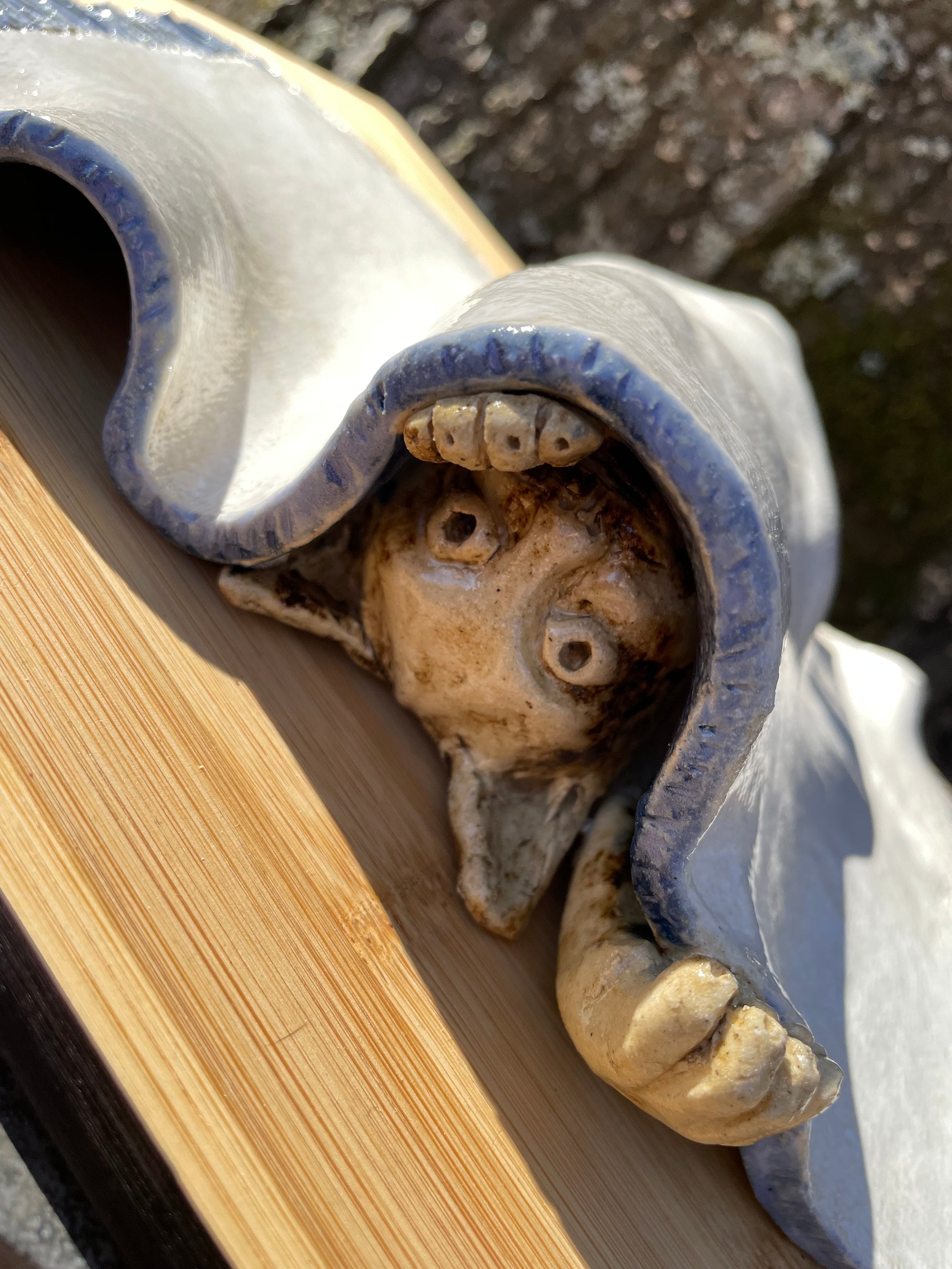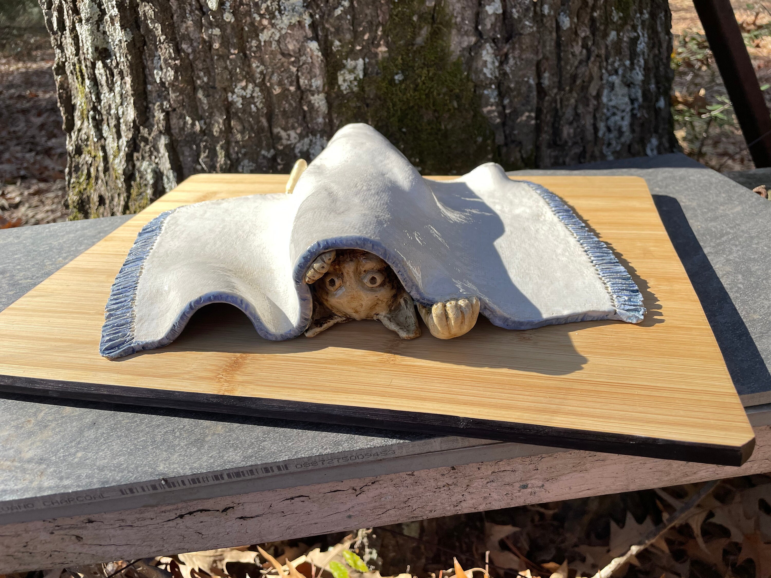 This unique hand sculpted piece, a playful kitten peeks from under a towel on a hardwood floor. It bid make from stoneware clay, and mounted on wooden base with felt feet.