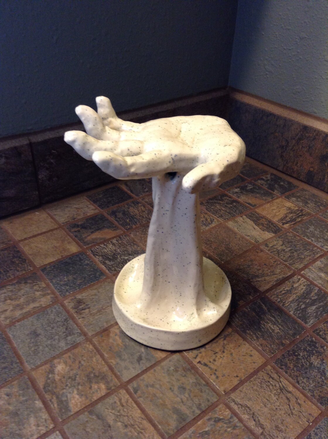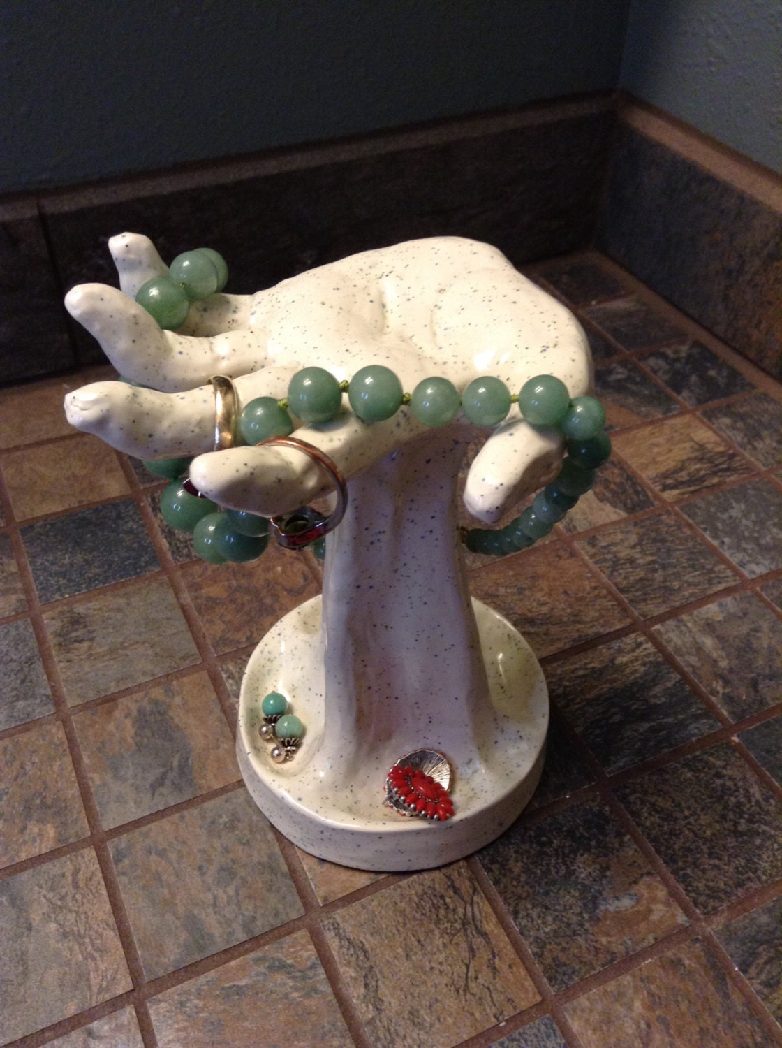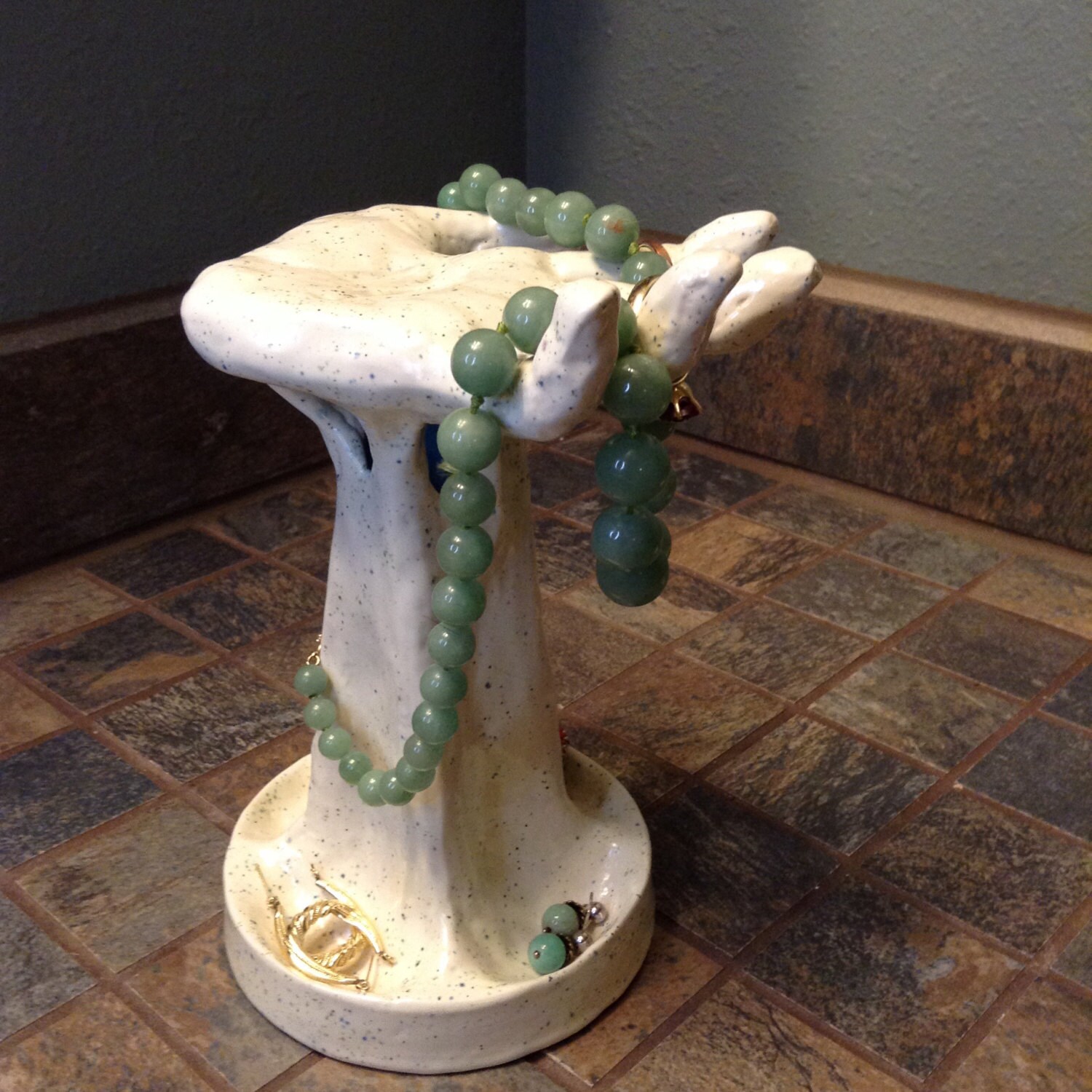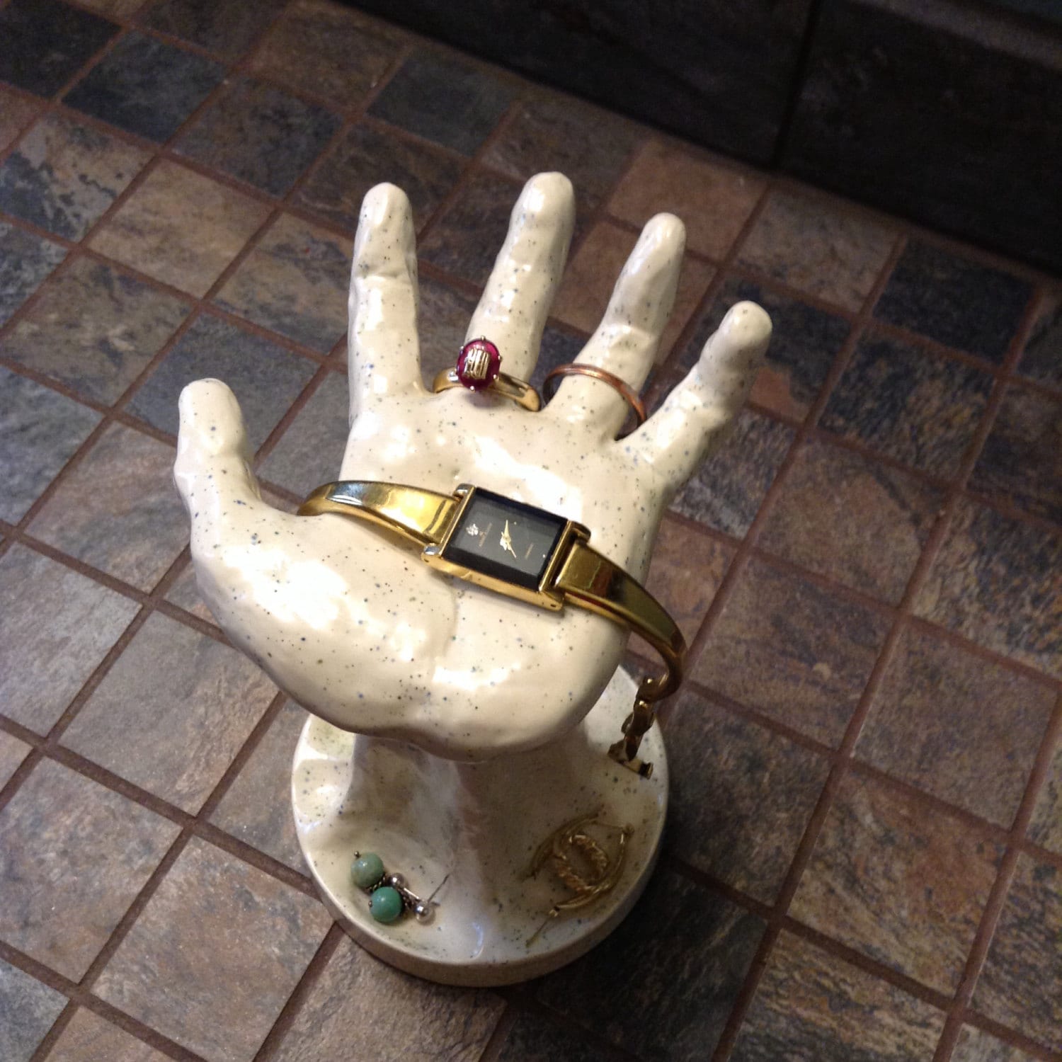 Hand sculpted and glazed, this piece is ideal as a catchall for jewelry and other small items. Put your rings on the fingers, drop earrings in the base, hang bracelets watches and necklaces from the palm and fingers. Works equally well for cuff links, tie tacks and lapel pins.